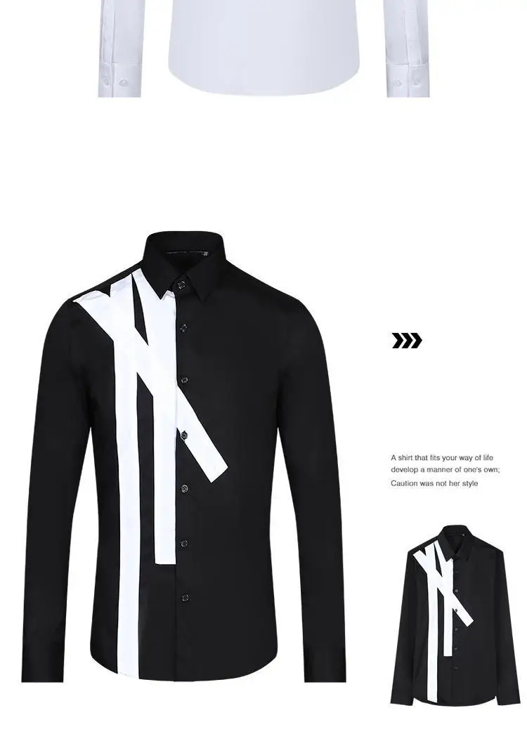 New Patch Splicing Mens Shirts High Quality Long Sleeve Black White Casual Mens Dress Shirts Slim Fit Party Male Shirts 3XL