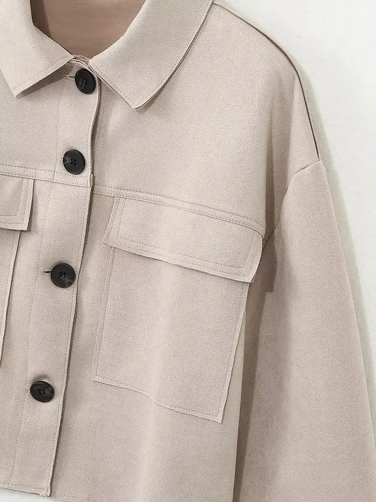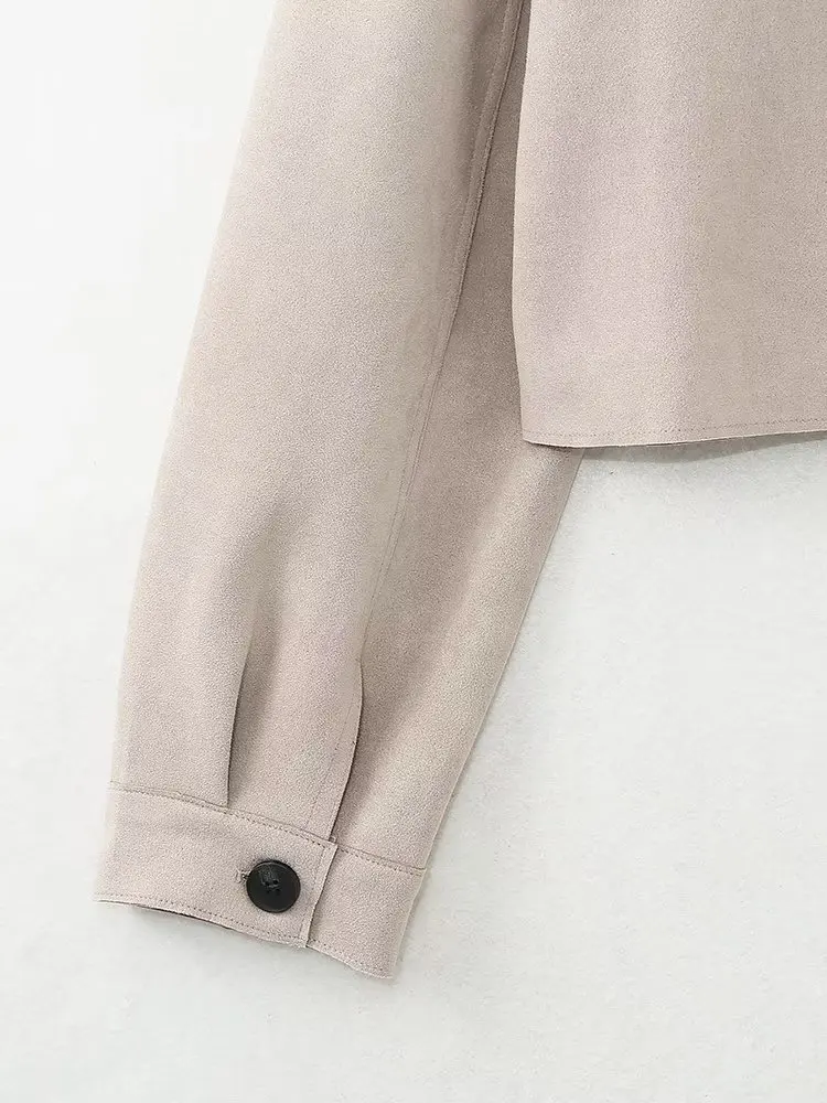 New Vintage Faux Suede Outerwear Jacket Female Patch Pockets Lapel Collar Coat 2024 Autumn Winter Women Long Sleeve Short Jacket