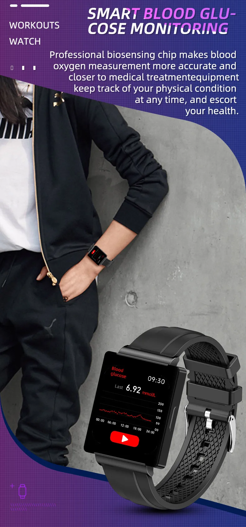 KS01 Non Invasive Blood Glucose Smart Watch Heart Rate BP Body Temperature Monitoring Waterproof Fitness Tracker Bracelet