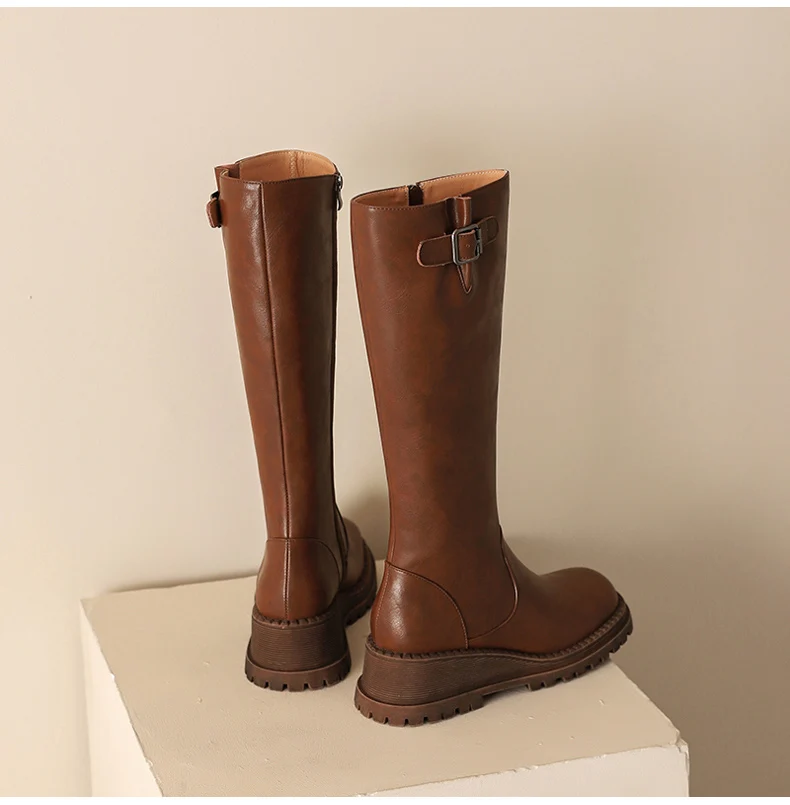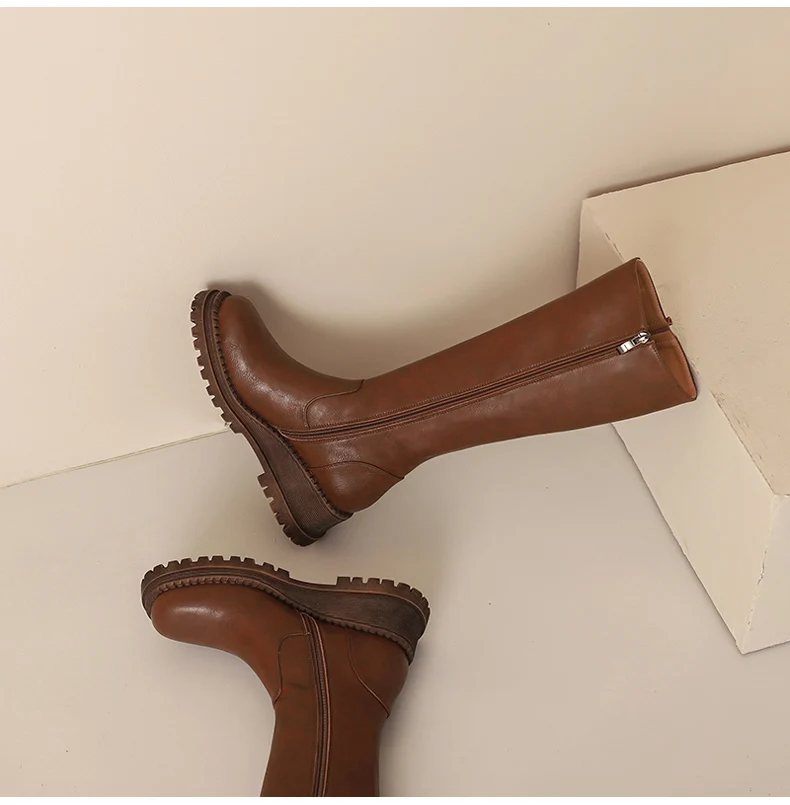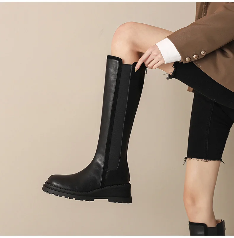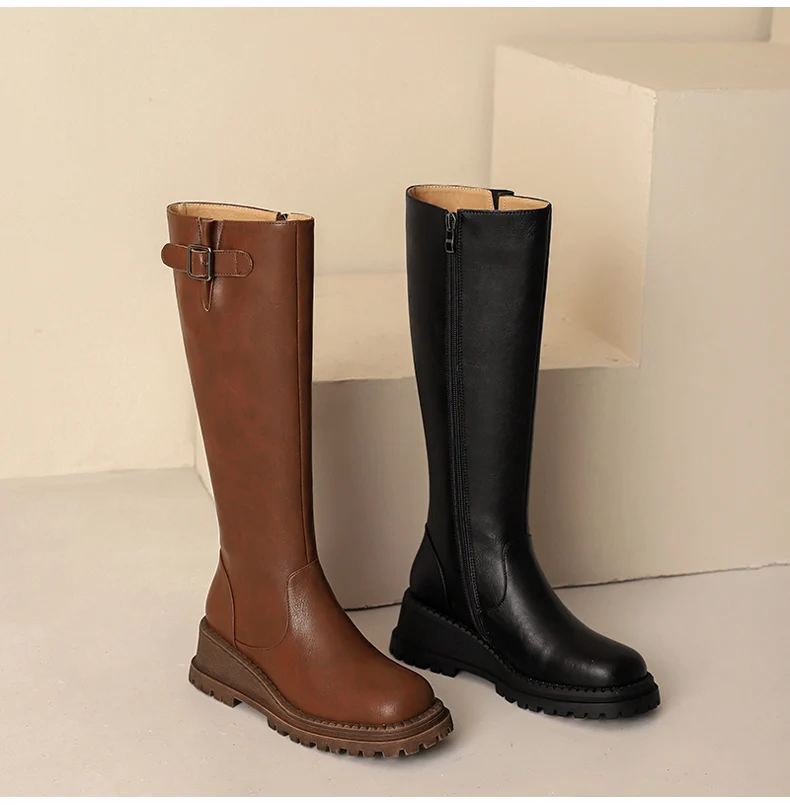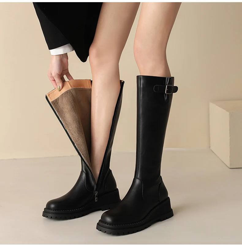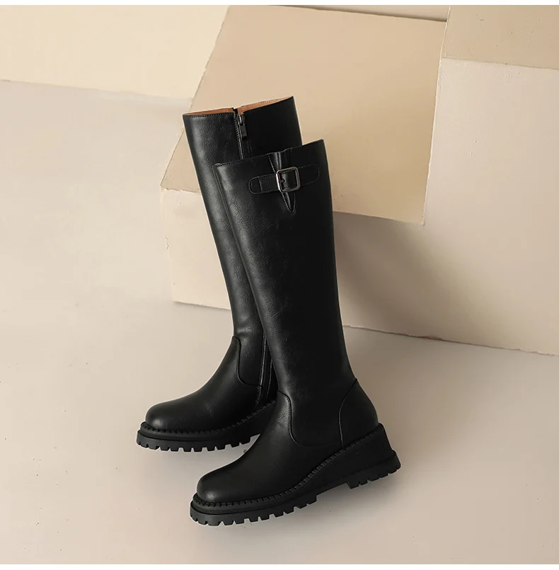 ODS 2024 Women Knee-High Boots Genuine Leather Round Toe Thick high Heels Zipper Casual Party Autumn Winter Shoes Woman 40 41 42