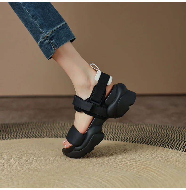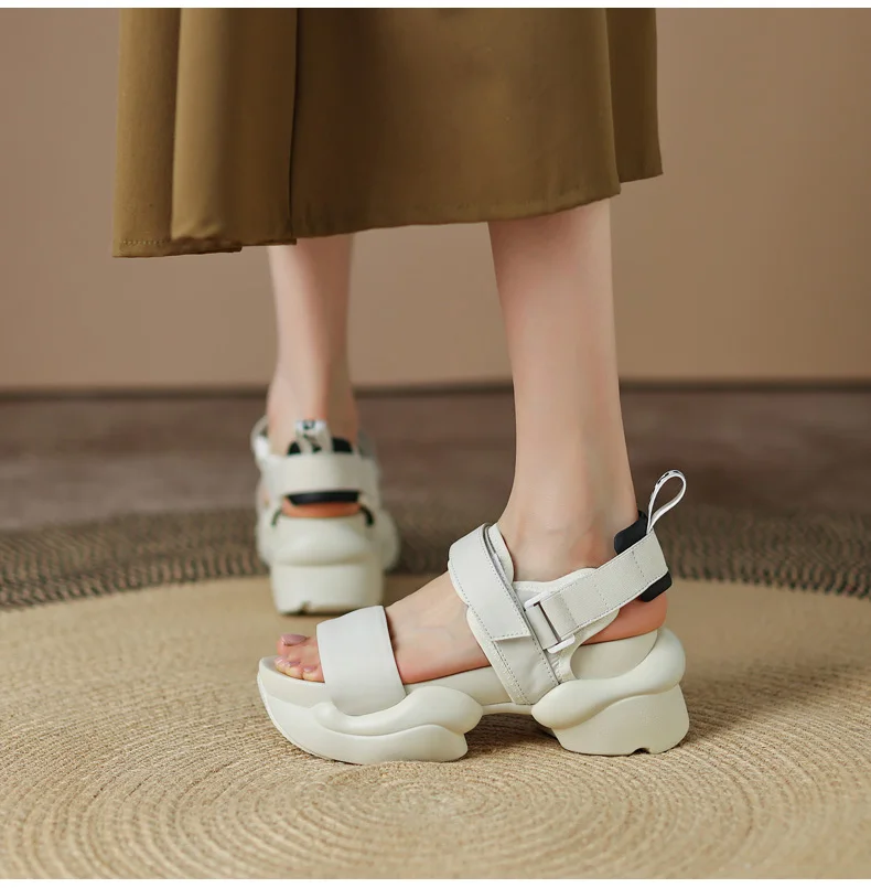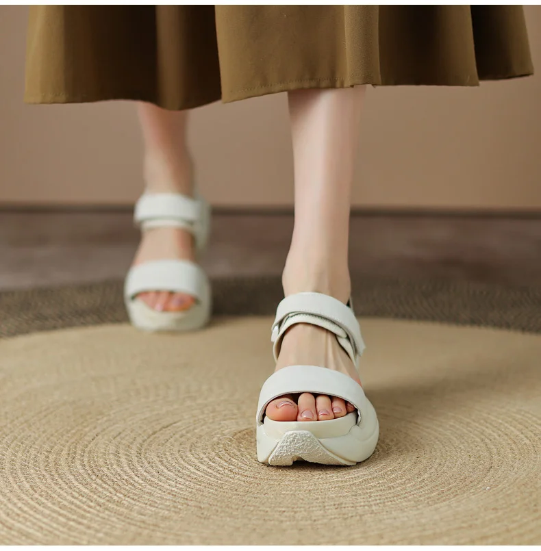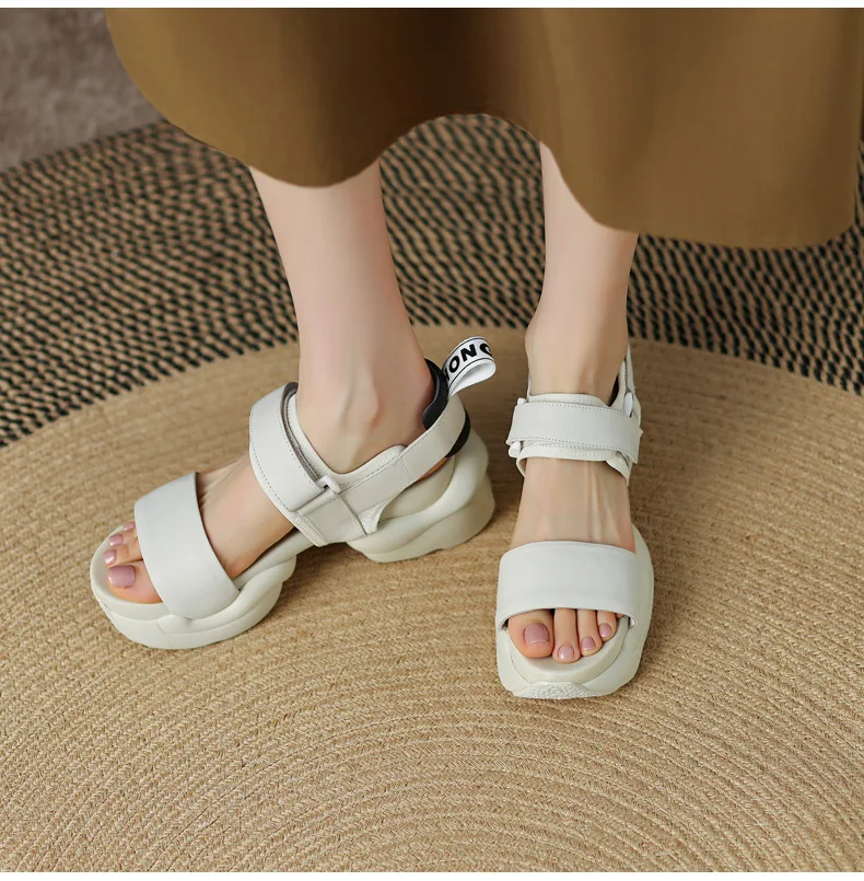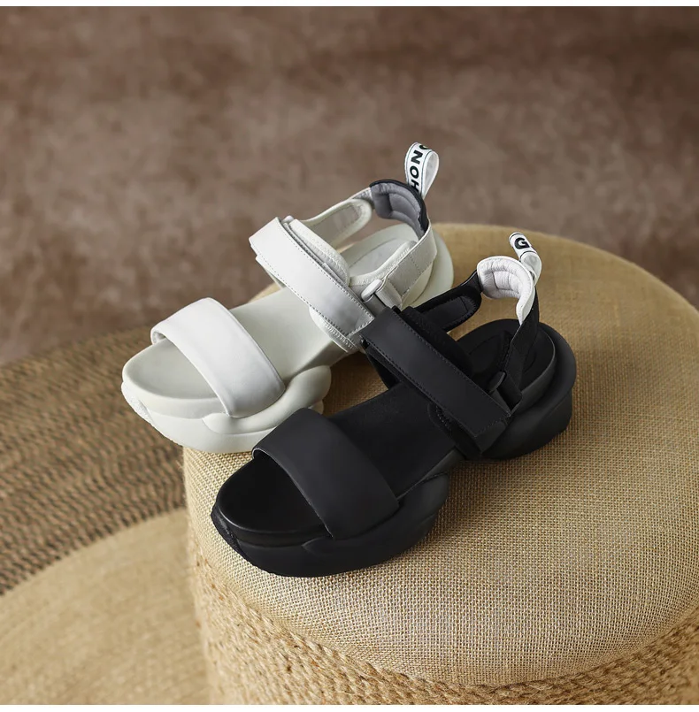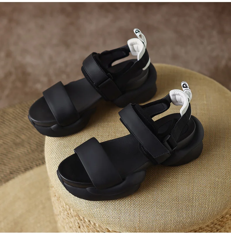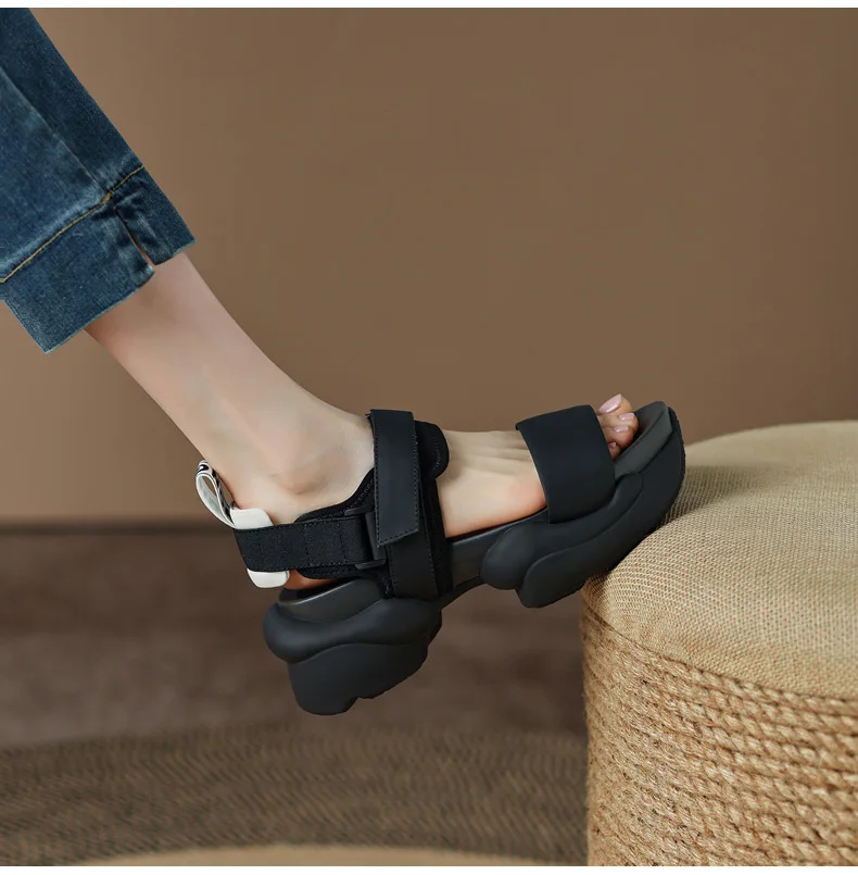 ODS Chic Women Real Genuine Leather Sandals Thick Sole Chunky Heels Goth Shoes Summer Ladies Flat Platform Sandal Hook&Loop 4142