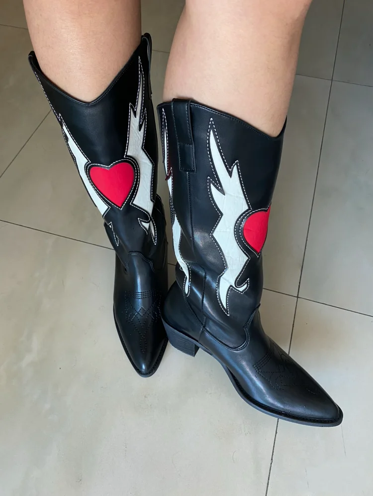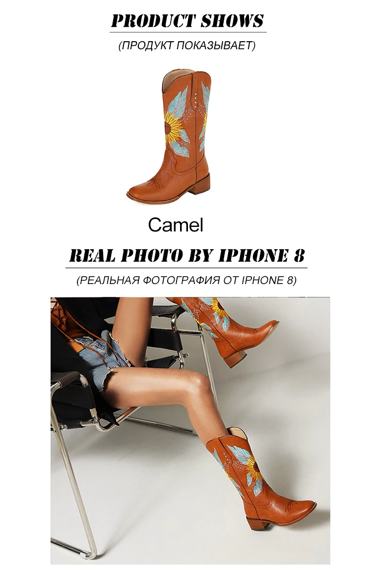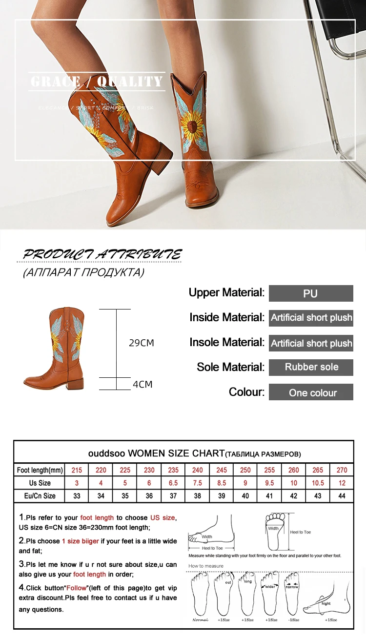 ODS Women Boots 2024 New Sunflower Embroidery Pointed Toe Slip On Mid-calf Autumn Winter Dark Brown Large Size 41 42 43 45 46