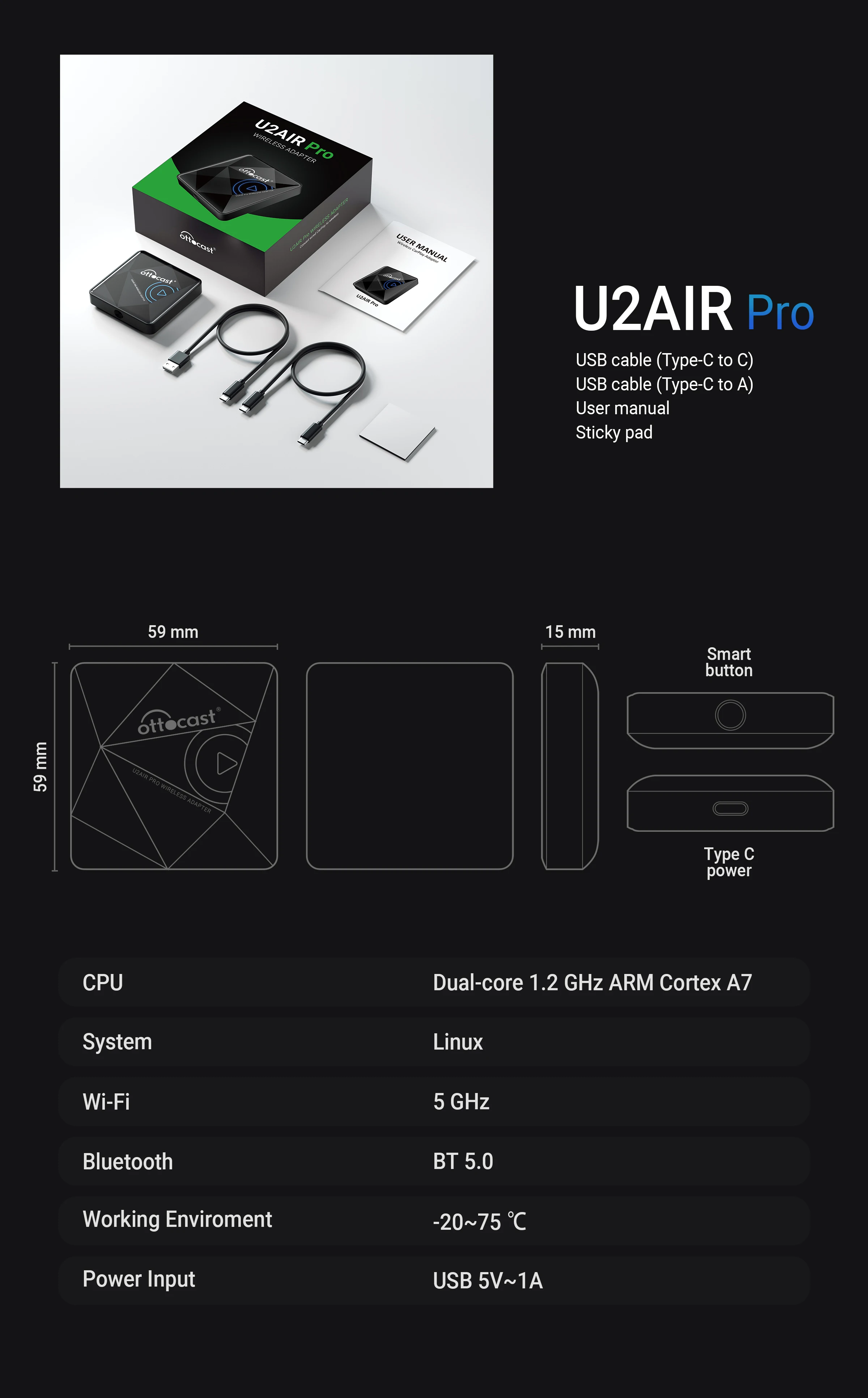OTTOCAST Wireless CarPlay U2AIR Pro Adapter for iPhone Car Play Apple Dongle For Audi VW Benz Kia Honda Toyota Ford Auto Connect