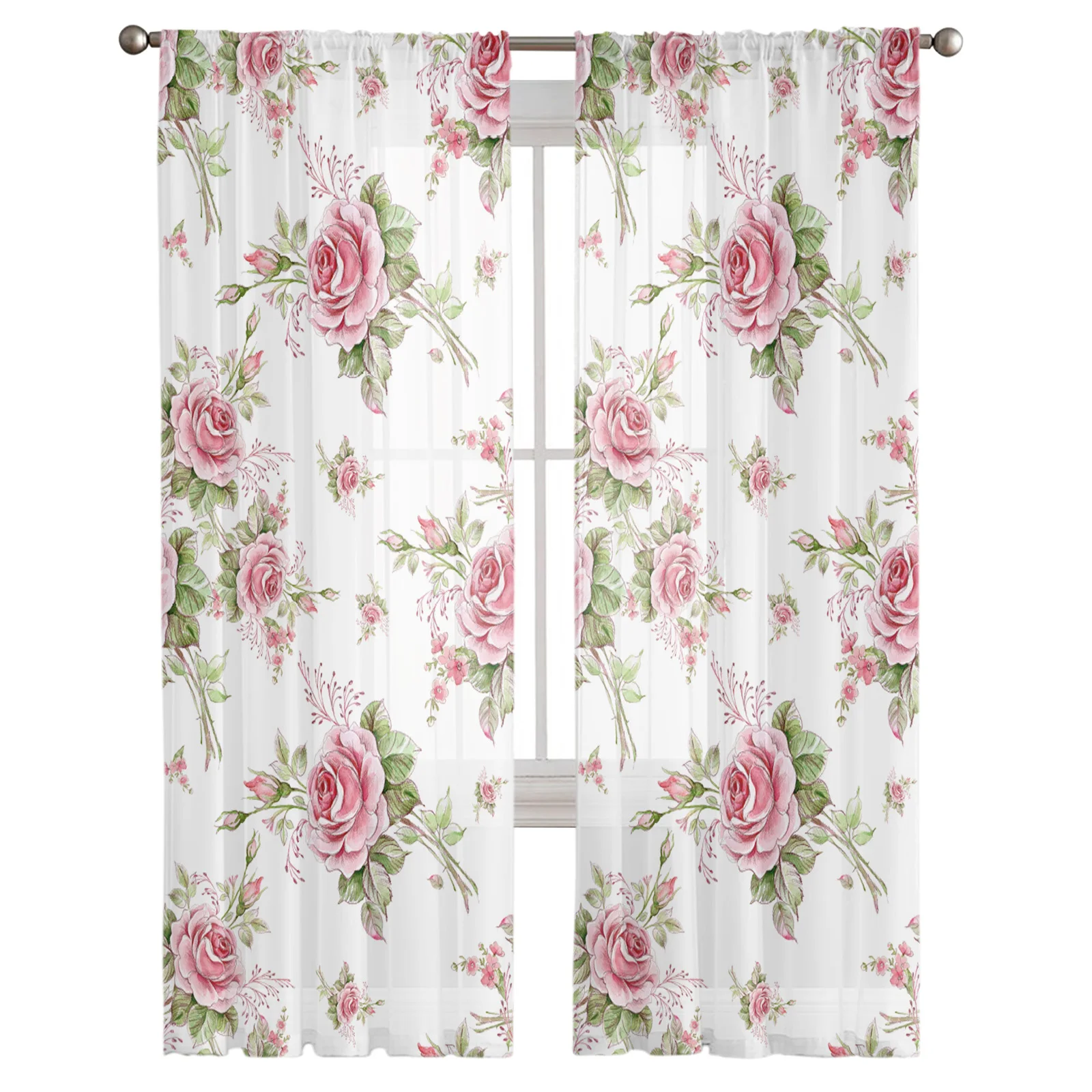 Pink Rose Romantic Luxury Tulle Curtains Modern Living Room Kitchen Chiffon Curtain Bedroom Sheer Valance Curtain