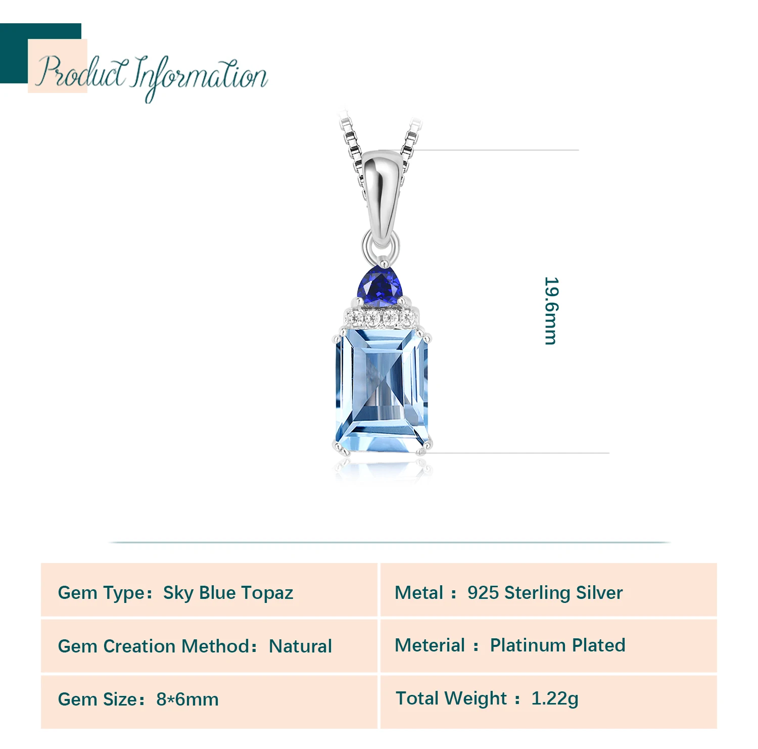 Potiy Emerald Cut Sky Blue Topaz Created Sapphire 925 Sterling Silver Pendant Necklace for Woman Without Chain Daily Jewelry