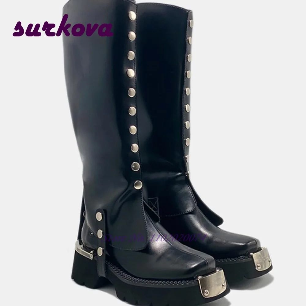 Punk Knight Boots Square Toe Button Design Splicing Retro Boots Female Thick Bottom Side Zipper Two Wear Western Boots Sexy Shoe