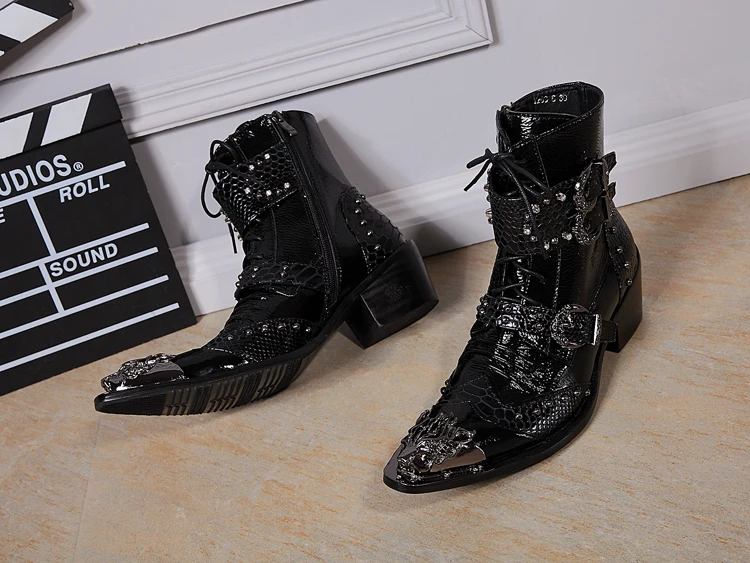 Punk Style Leather Men Shoes Military Cowboy Ankle Boots High Rubber Boots Metal Pointed Toe Lace Up Buckle Shoes Men