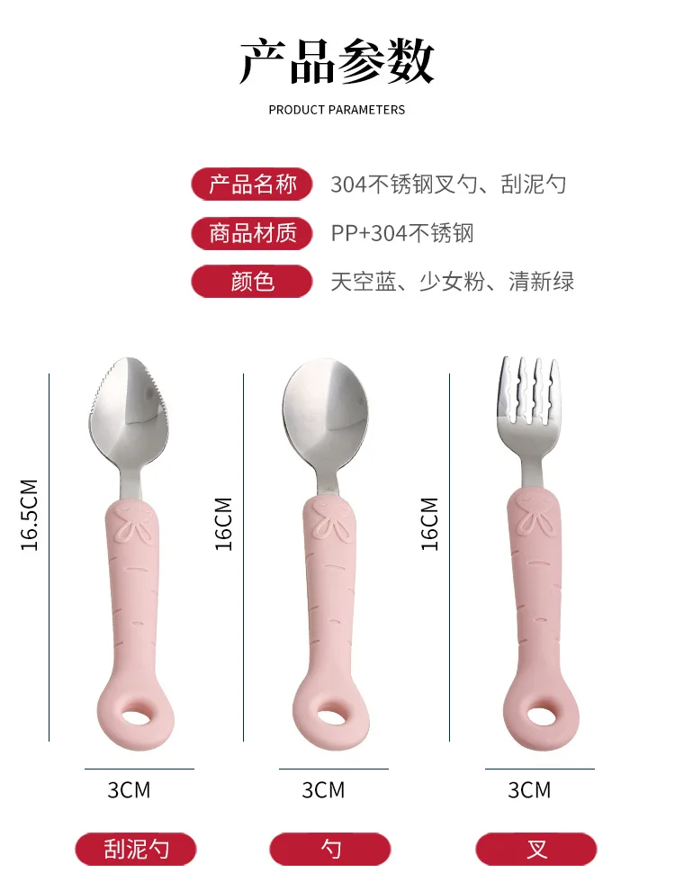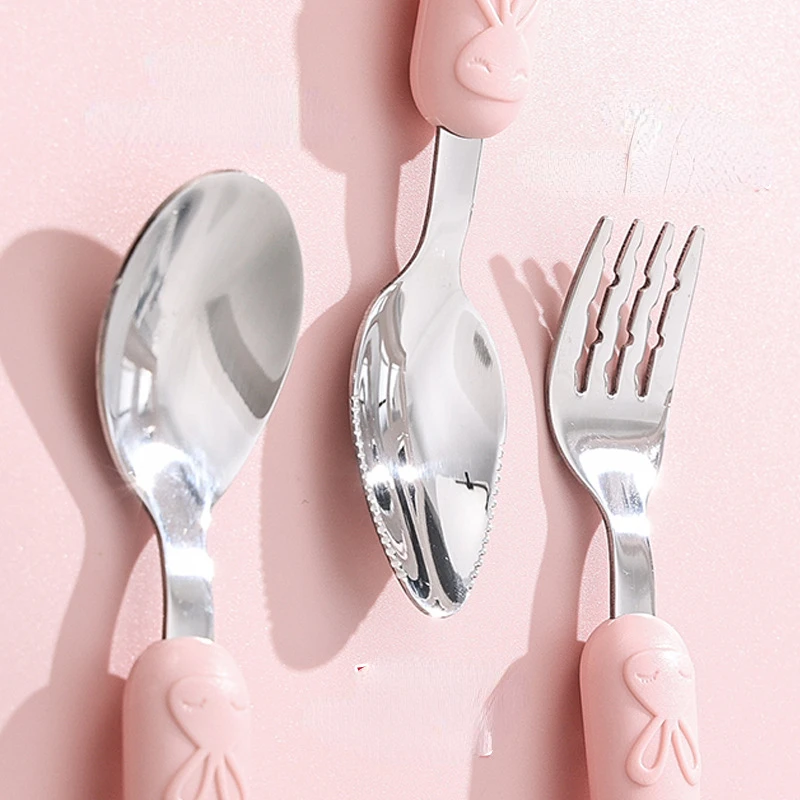 Rabbit Kids Fork Stainless Steel Children’s Small Spoon Cartoon Pattern Baby Feeding Spoon and Fork Portable Box Tableware Set