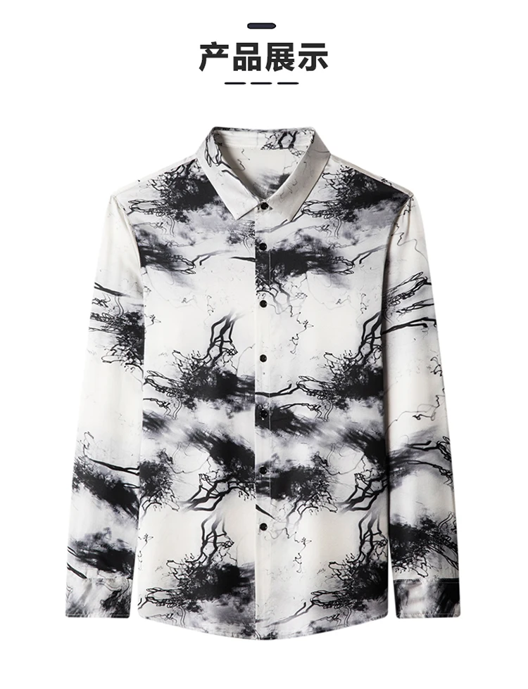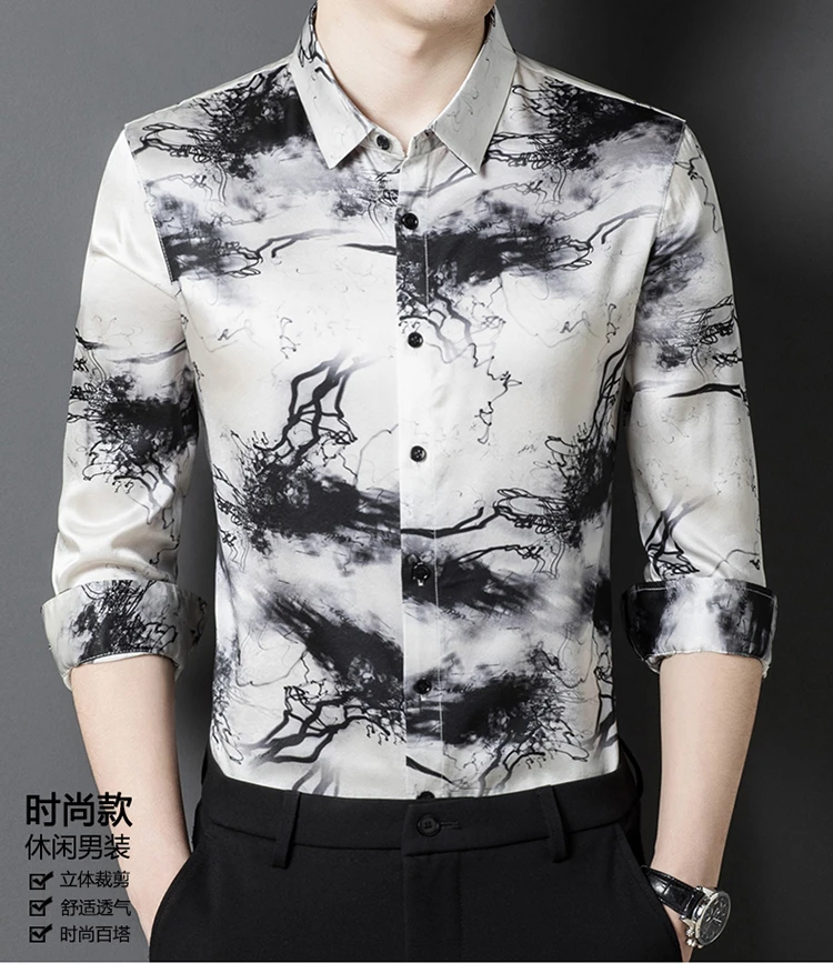 Real Silk Ink 3D Printing Dress Men Shirt Long Sleeved Easy Care Spring Quality Soft Comfortable Gentleman Premium Chemise Homme