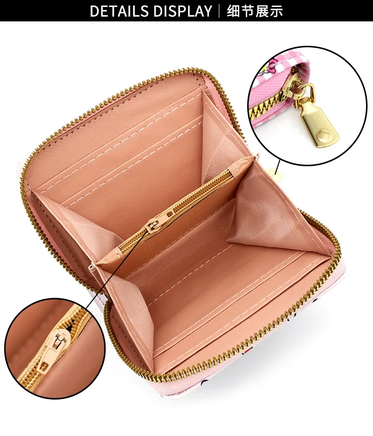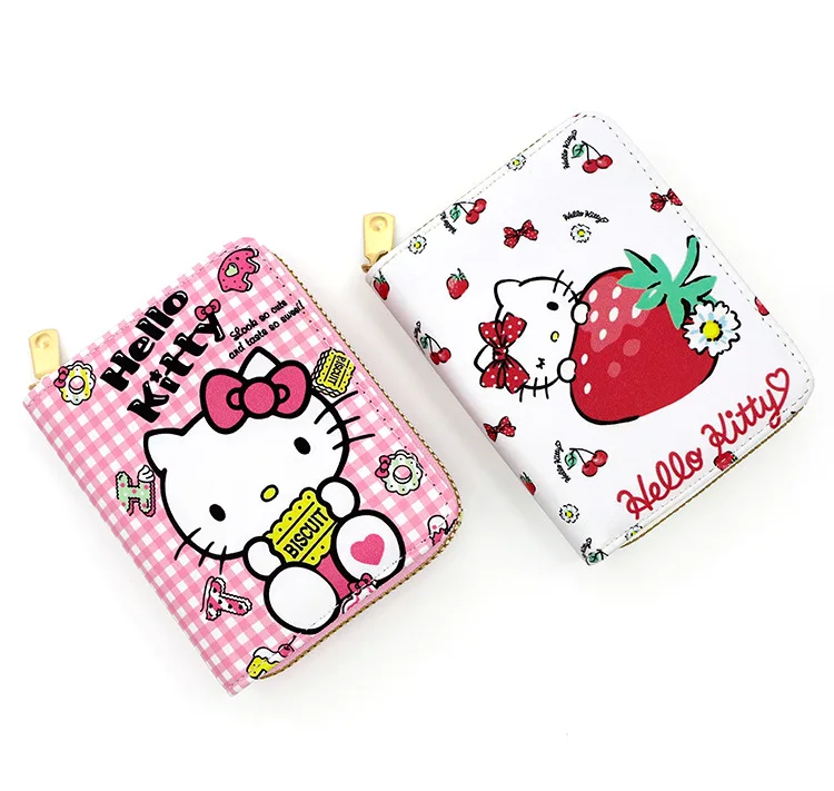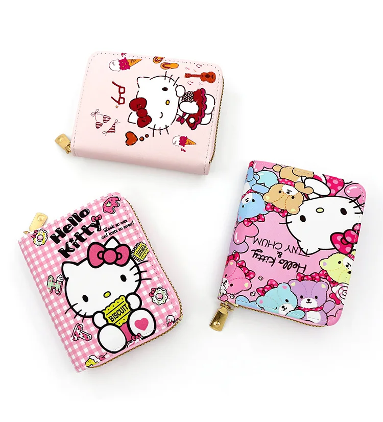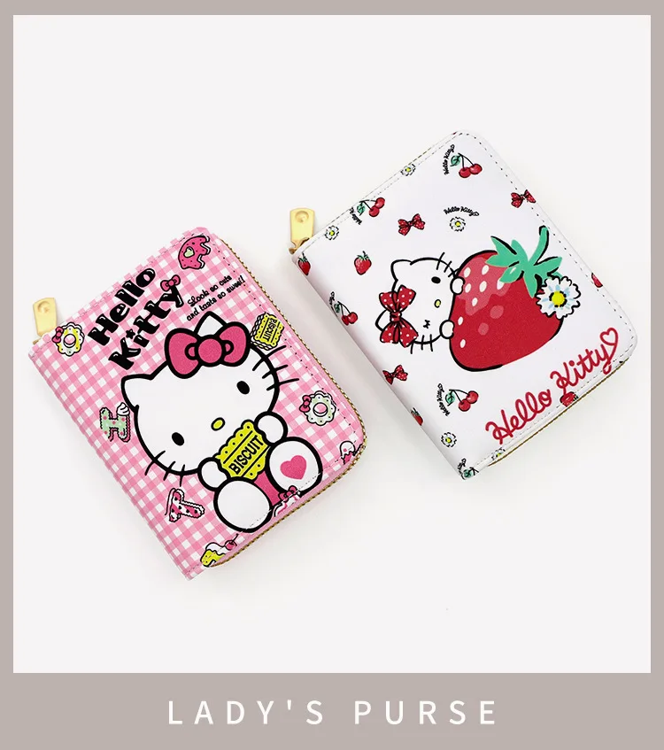 1. Stay cute and organized with the Cute Cartoon Women’s Coin Purse. Featuring the lovable Kitty character, this short, zippered wallet is perfect for carrying your loose change and other small items.