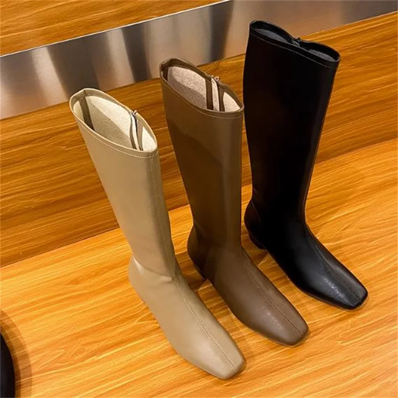 Sewing Lines Shoes for Ladies Square Toes Chassure Femme Leather Women Calf Boots Side Zippers Zapatos Mujer High Heels Botas