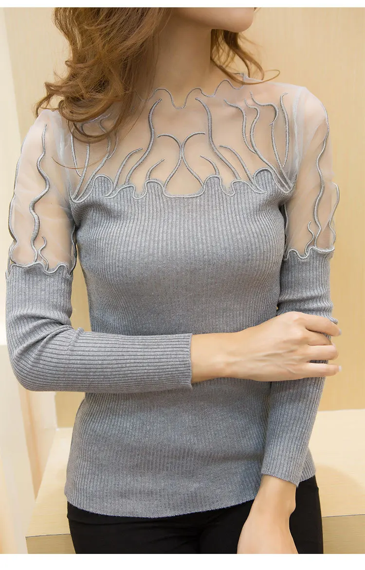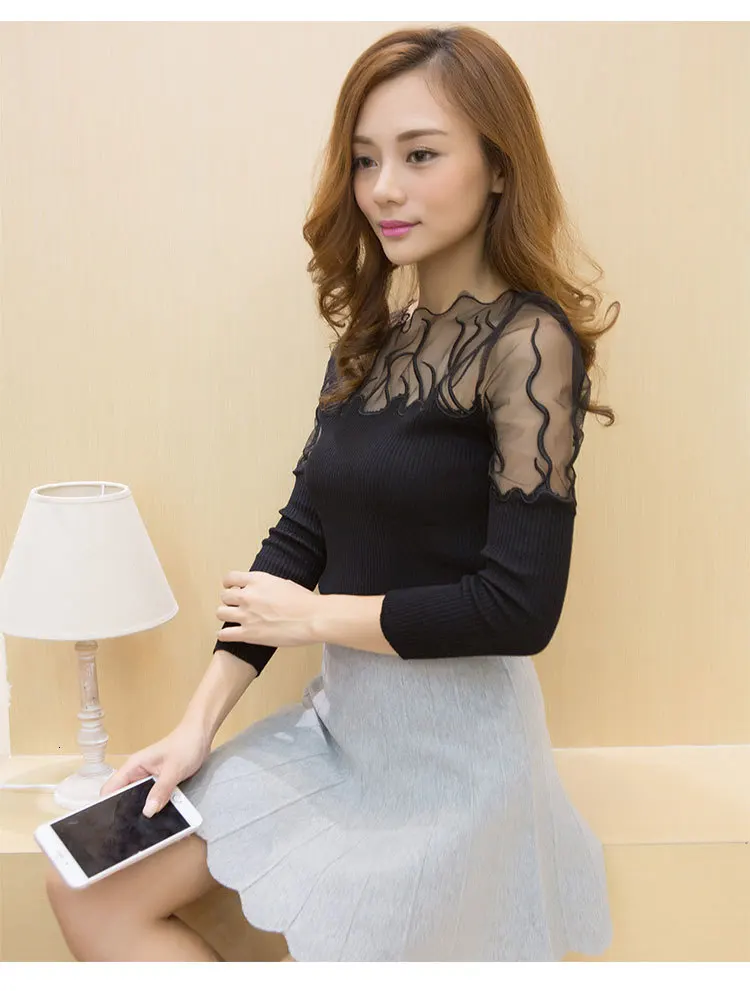 Sexy Slim Long-sleeved Pullovers Shirt Female Gauze Lace Stitching Knitted Sweater Fashion Women Sweater