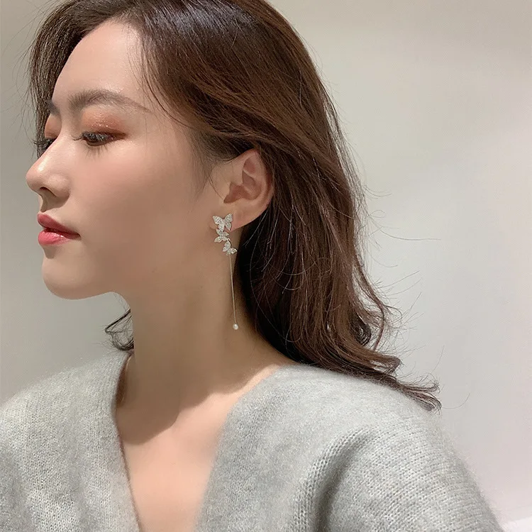 South Korea’s new super fairy butterfly earrings long tassel net red sweet earrings Trend Asymmetrical exquisite Ear Bone Clip