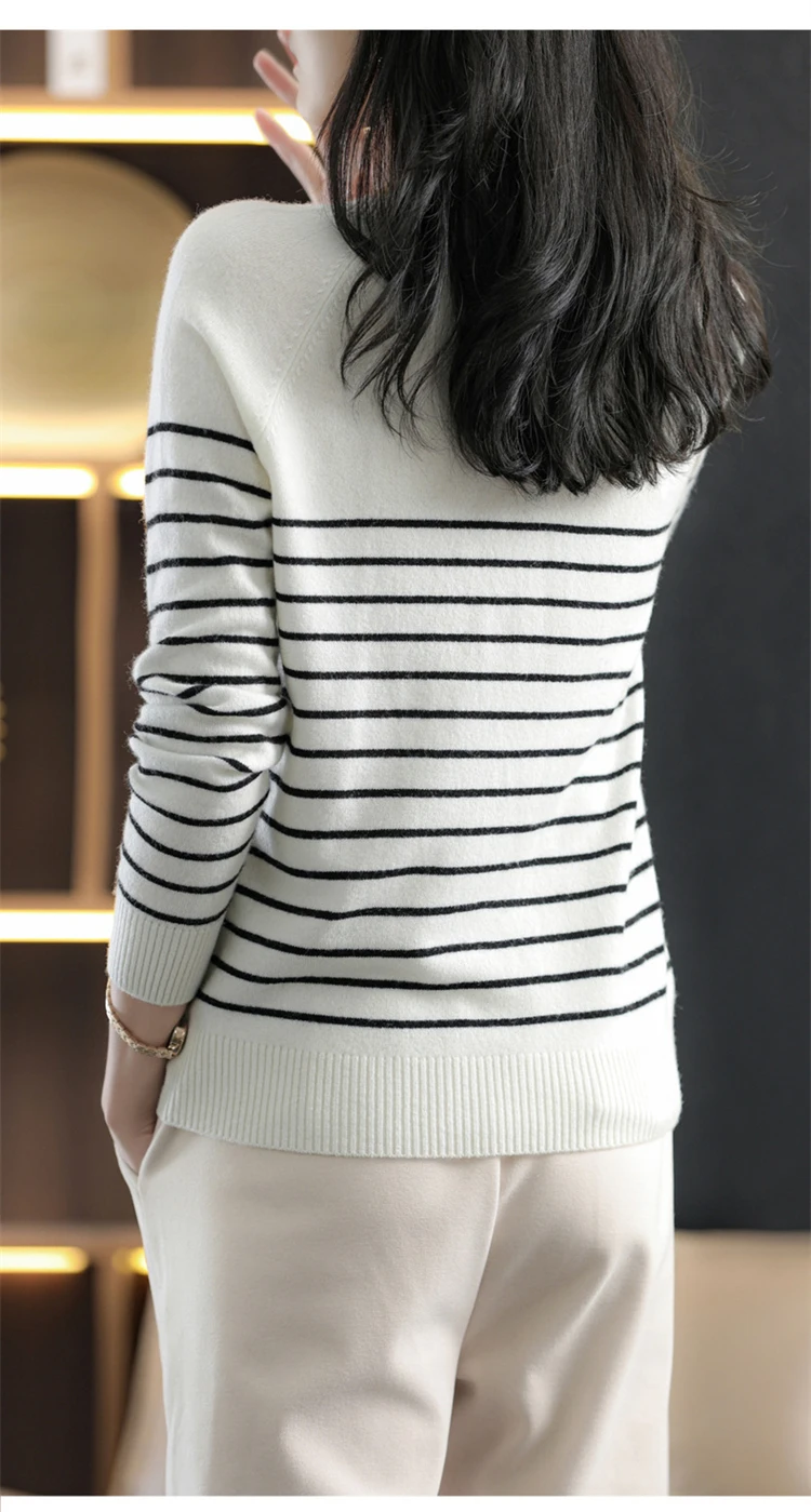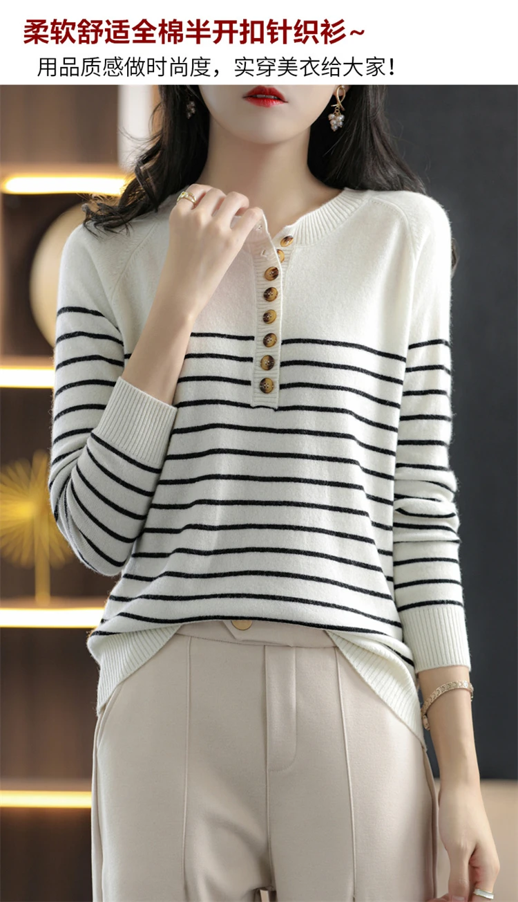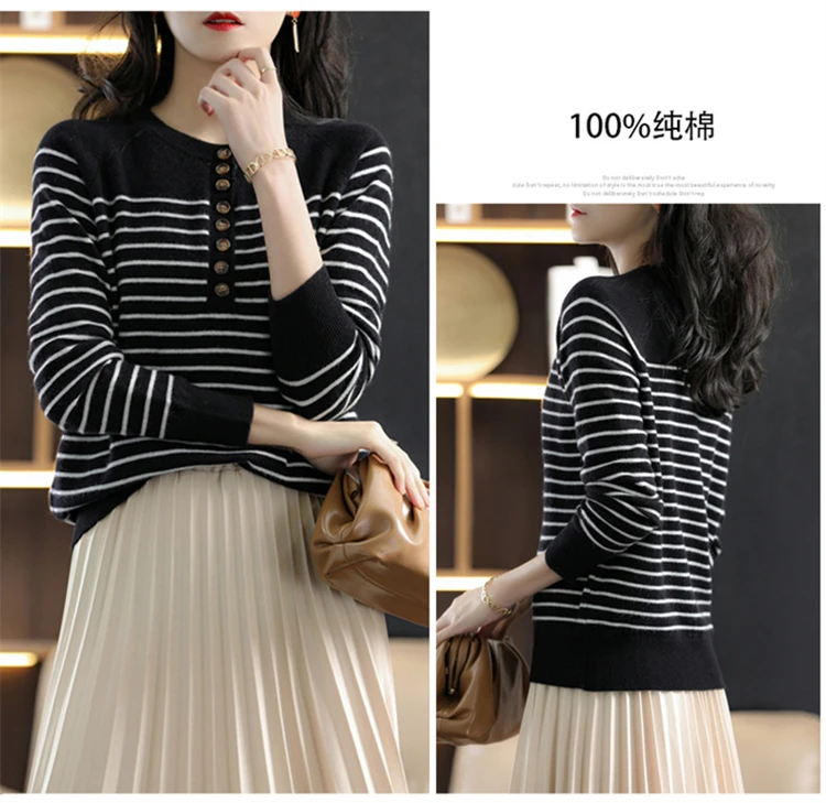 Spring and Autumn New 100% Cotton Sweater Women’s Casual Knitting O-Neck Long Sleeve Pullover Loose Stripe Warm Women’s Top