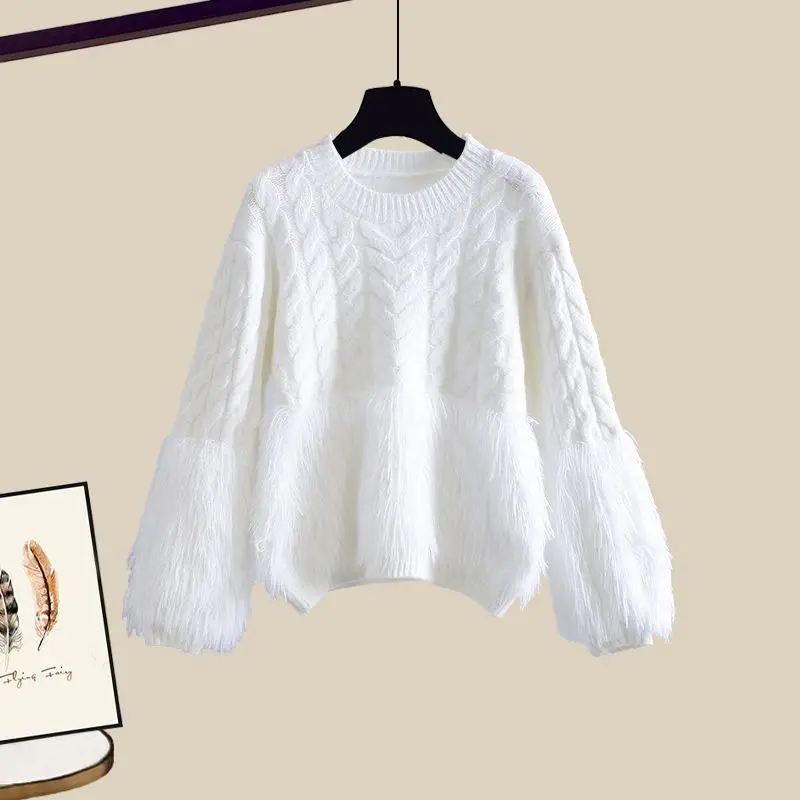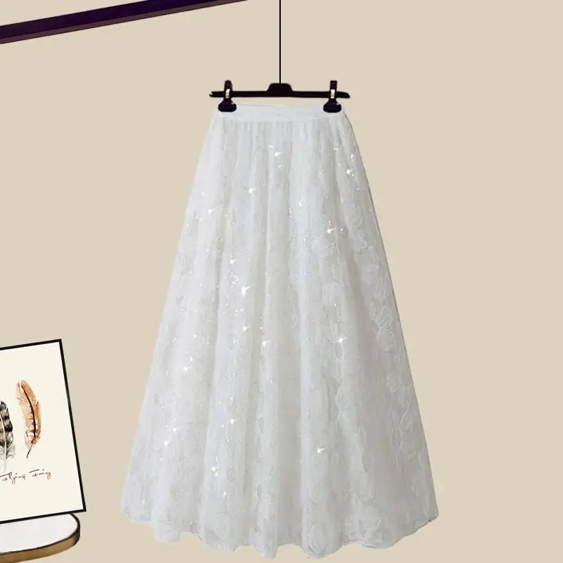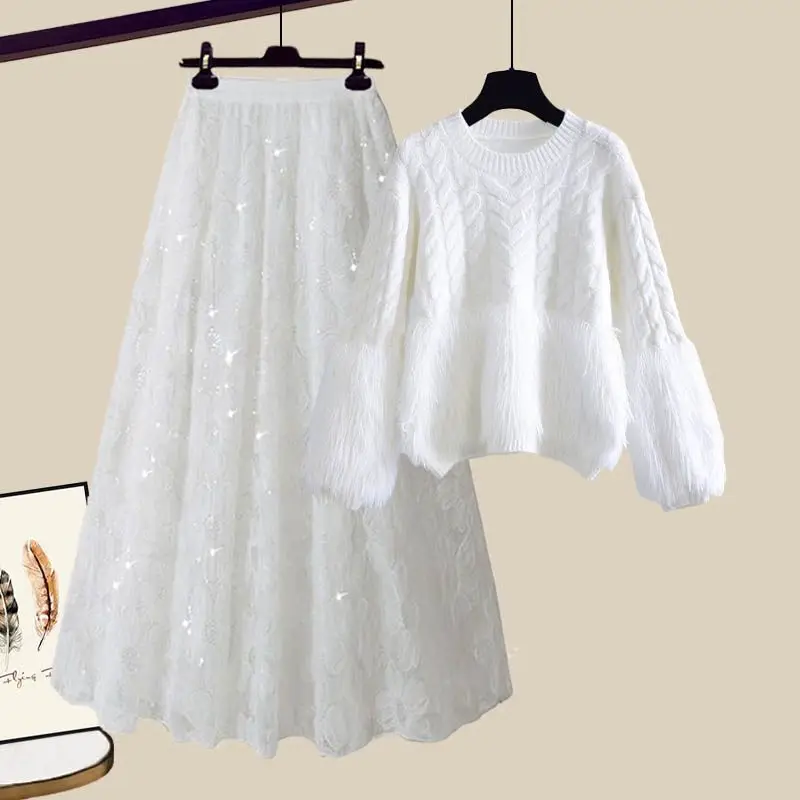 Spring Large Size Women Two Piece Skirt Suit New Patchwork Sweater+Long Fairy Skirt Tutu A-Line Mesh Skirt two-piece set
