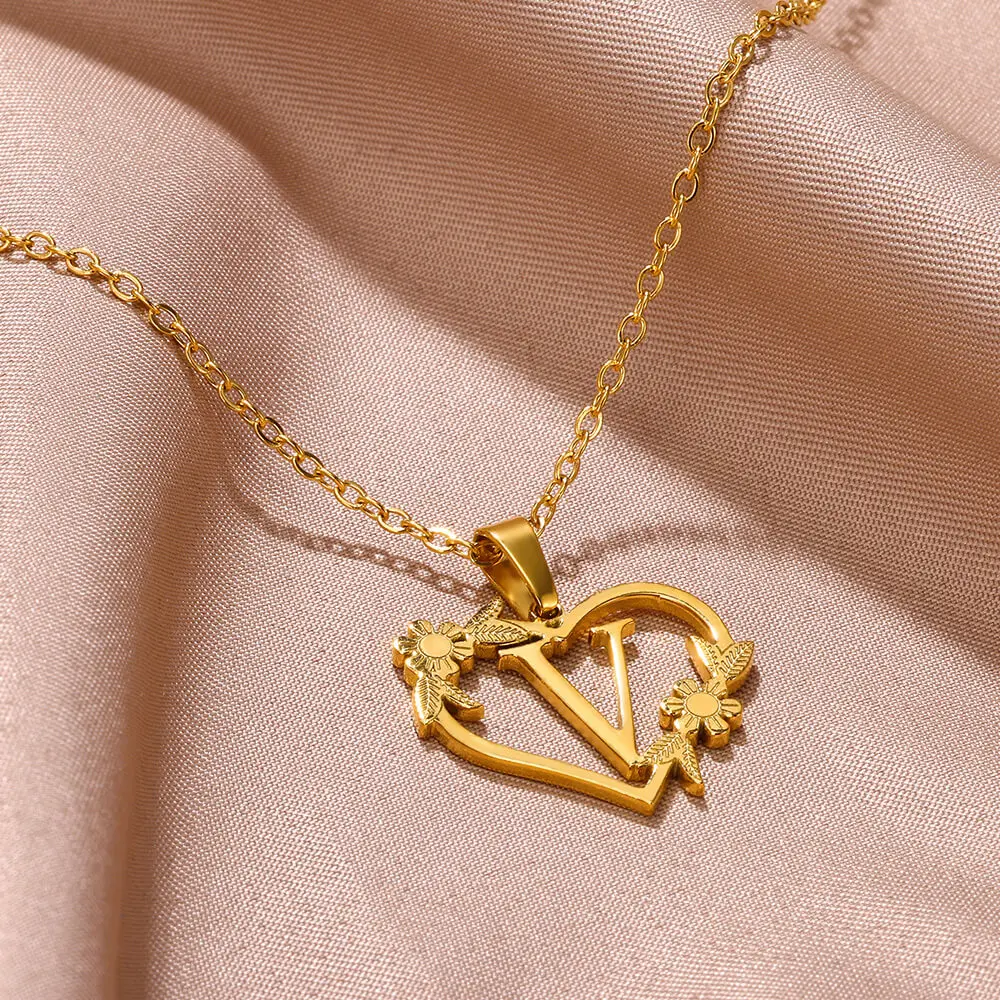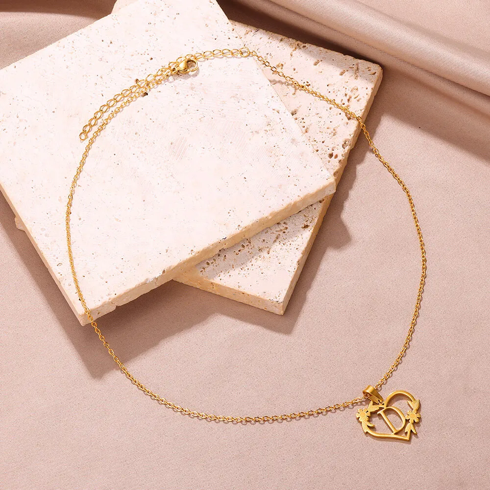 Stainless Steel Heart A-Z Letter Necklaces For Women Flower Pendant Choker Necklace Jewelry Gift Accessoriesy 2023