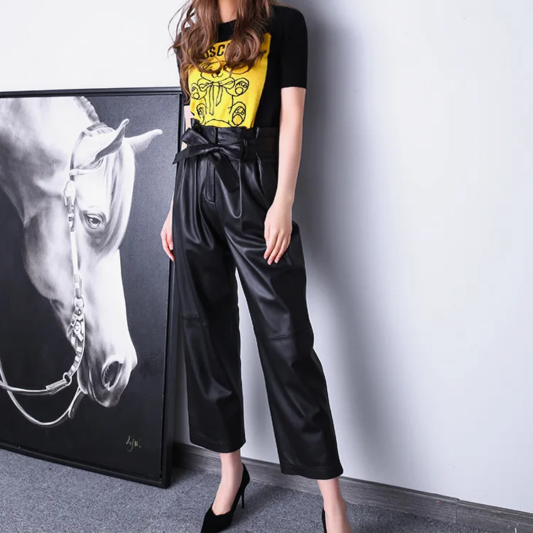 Straight Pants Women Female Genuine Leather Nappa Folded High