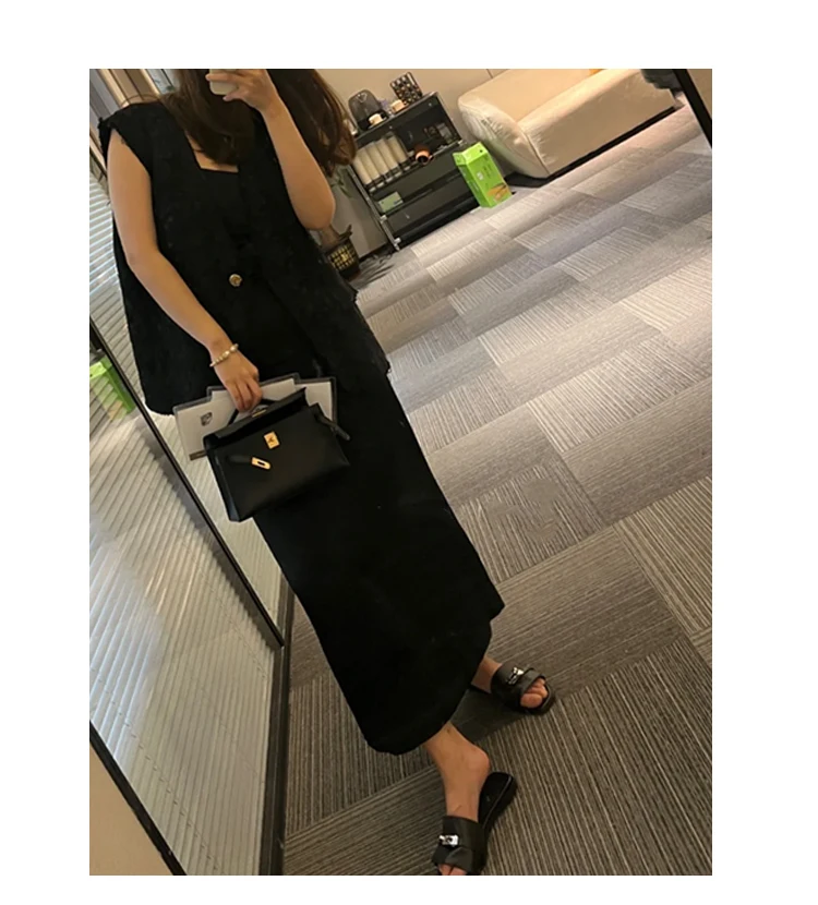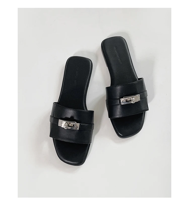 Summer New Black Sandals Women Metal Locking Flat Slippers Ladies