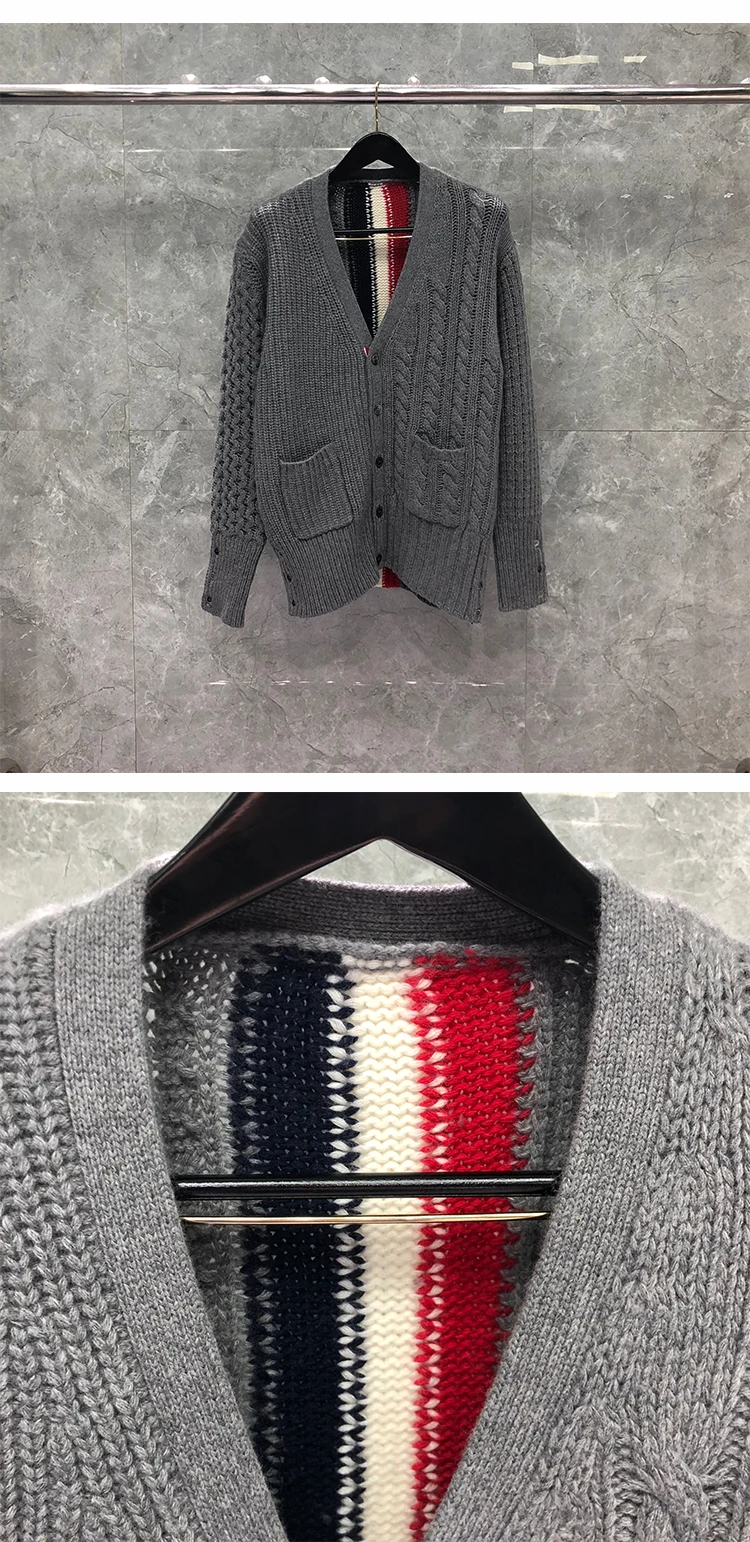 TB THOM Sweater Autunm Winter Sweater Male Fashion Brand Gray Donegal Tweed Filey Stitch Center Back Stripe V-Neck Cardigan Coat