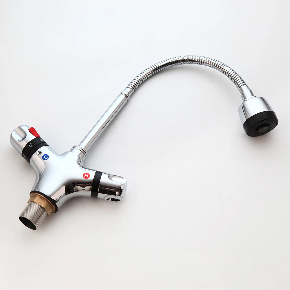 Torayvino Chrome Polished Kitchen Faucet Rain & Column Water Twist Swivel Spout Deck Mount Thermostatic Control Basin Mixer Tap