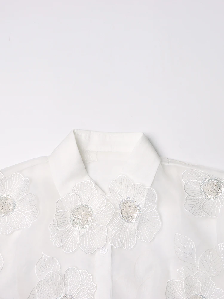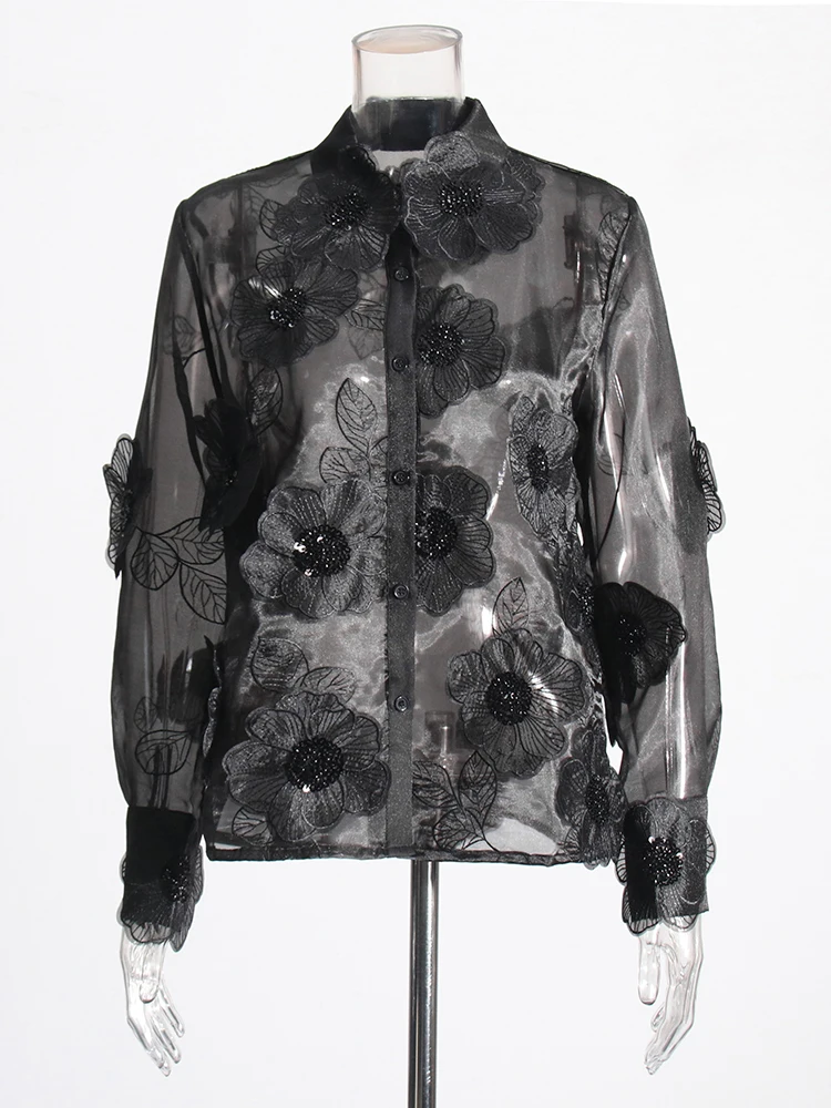 TWOTWINSTYLE Elegant Spliced Appliques Shirt For Women Lapel Long Sleeve Patchwork Single Breasted Vintage Blouse Female Clothes