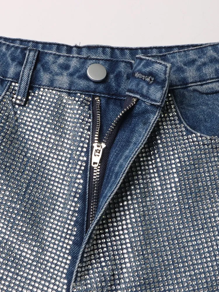 TWOTWINSTYLE Patchwork Diamonds Casual Denim Trousers For Women High Waist Pockets Designer Stragit Jeans Female Fashion Clothes