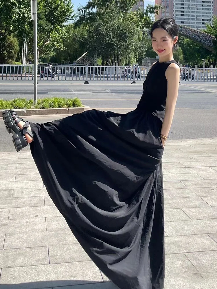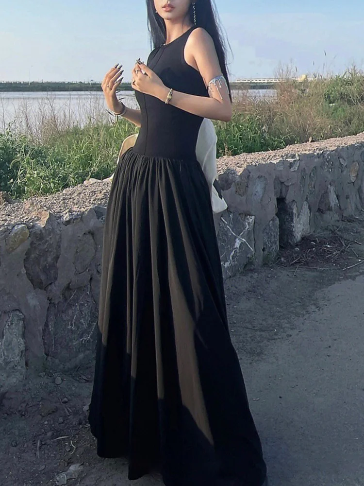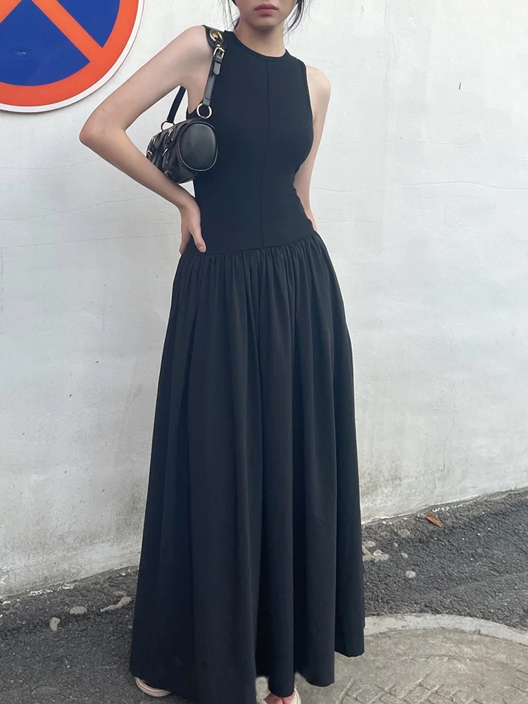 TWOTWINSTYLE Summer Slim Dress For Women Round Neck Sleeveless High Waist Spliced Pockets Long Dresses Female Clothing 2023 New