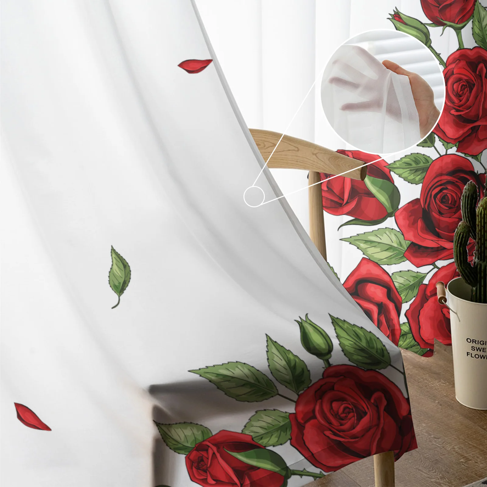 Valentine’S Day Rose Red Flowers Tulle Curtain Living Room Luxury Sheer Curtain Home Decor Chiffon Drapes Gauze Window Curtain