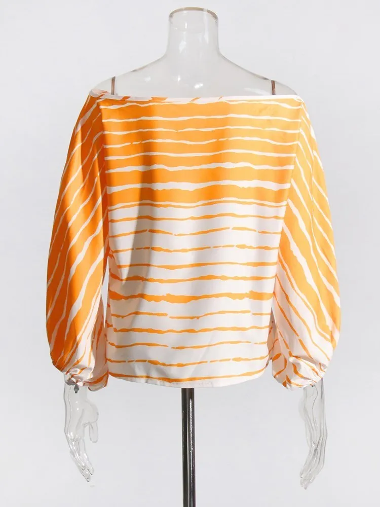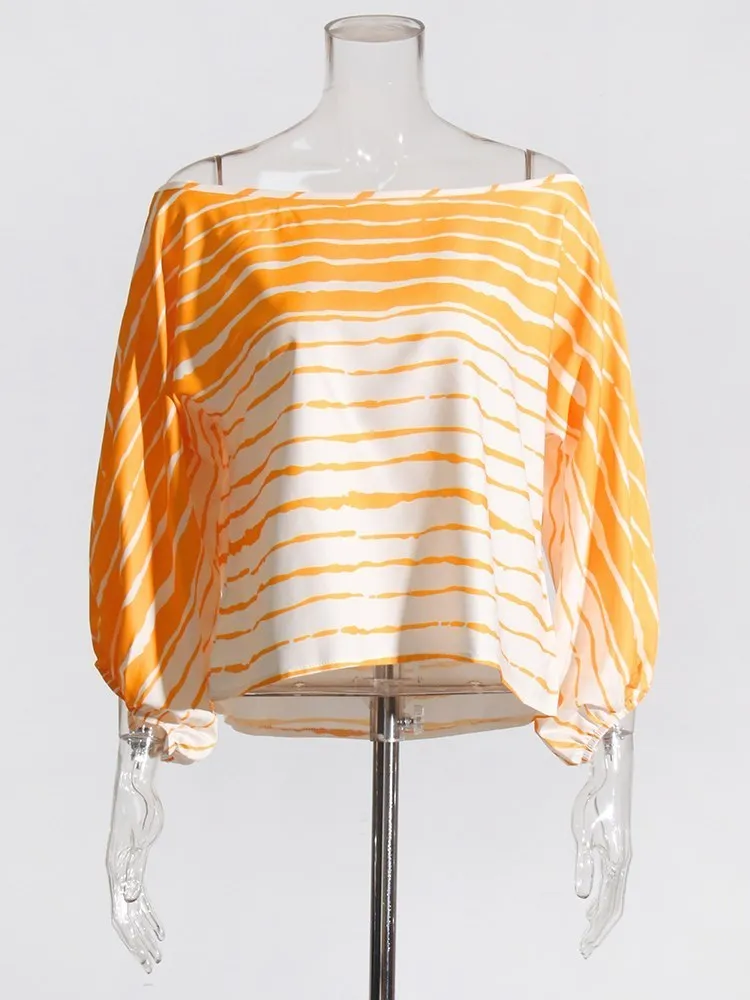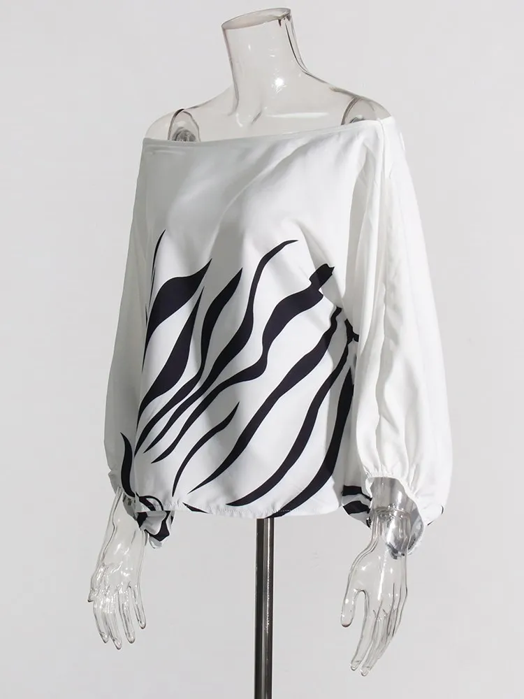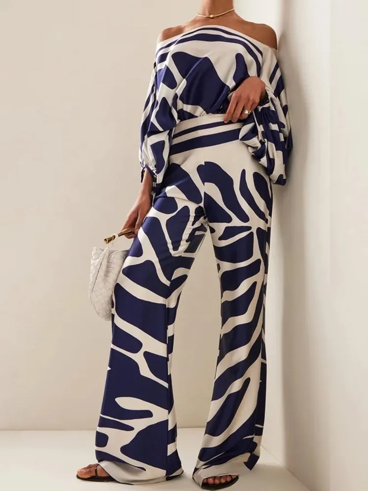 VGH Casual Hit Color Two Piece Set For Women Skew Collar Lantern Long Sleeve Tops High Waiat Wide Leg Pants Fashion Sets Female
