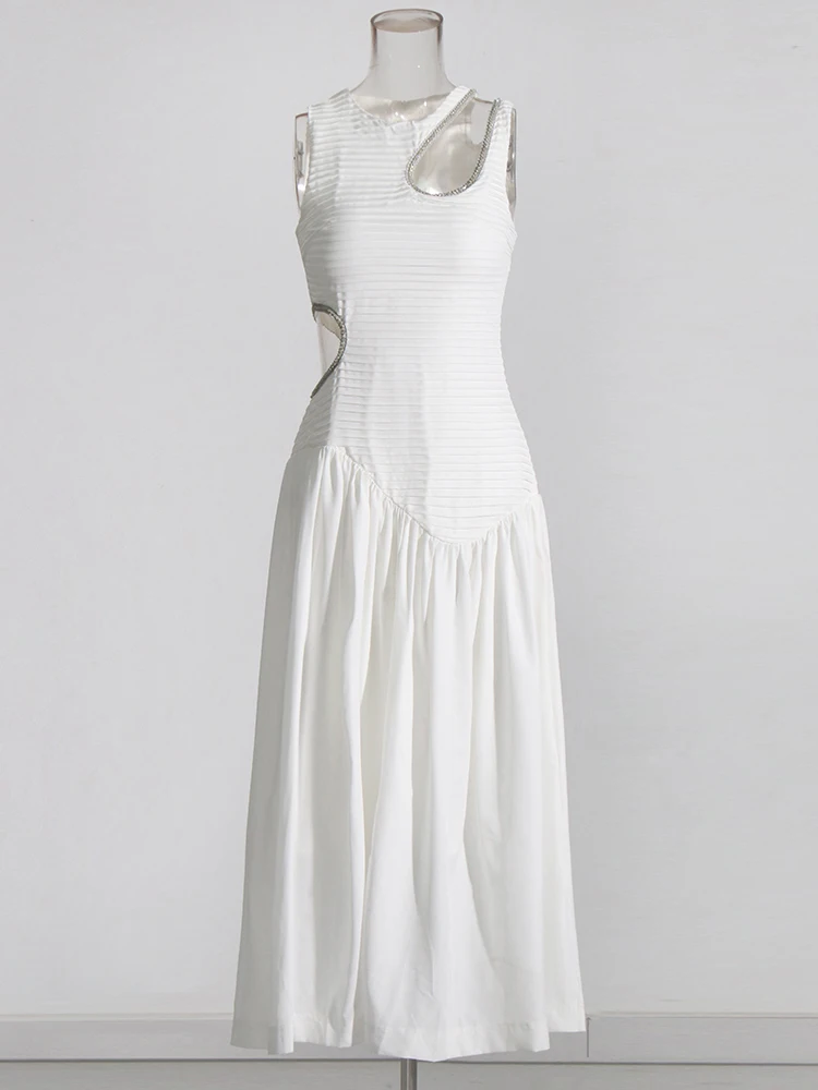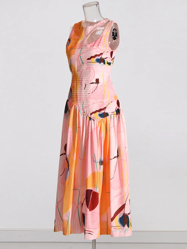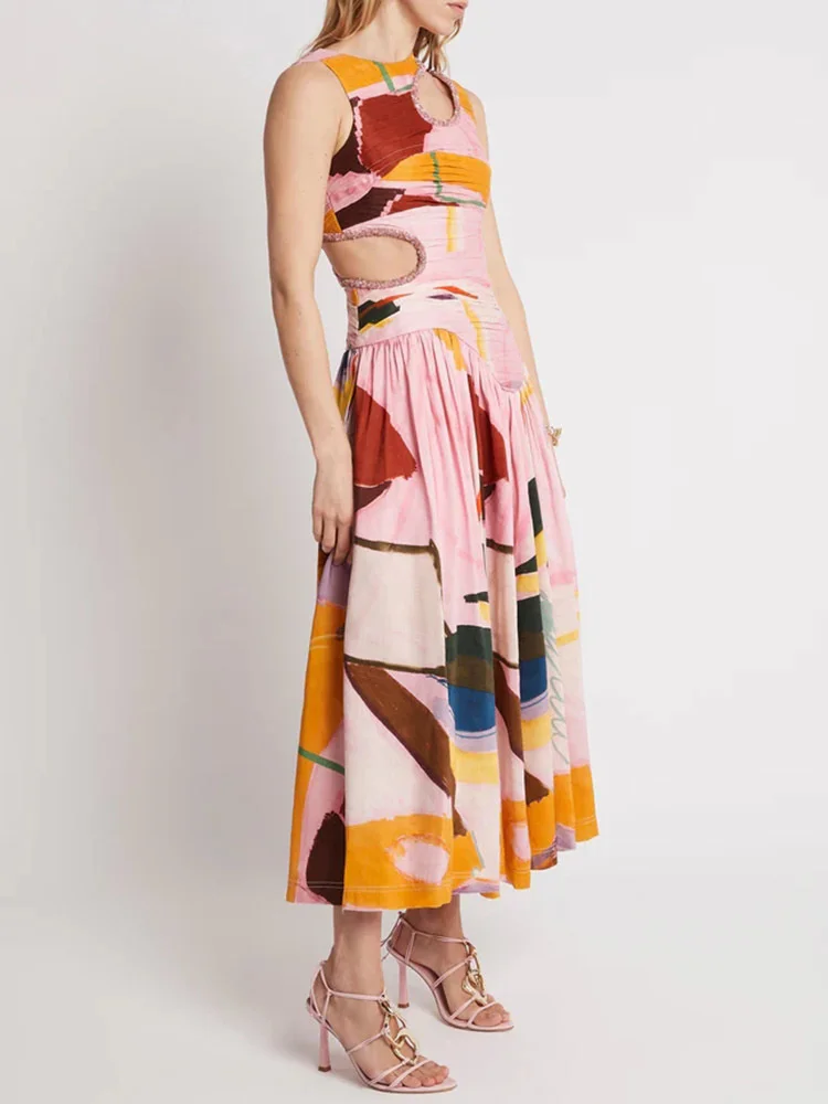 VGH Colorblock Printing Dresses For Women Round Neck Sleeveless High Waist Hollow Out Slimming Ruched Dress Female Summer New