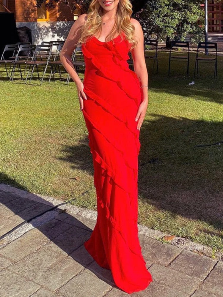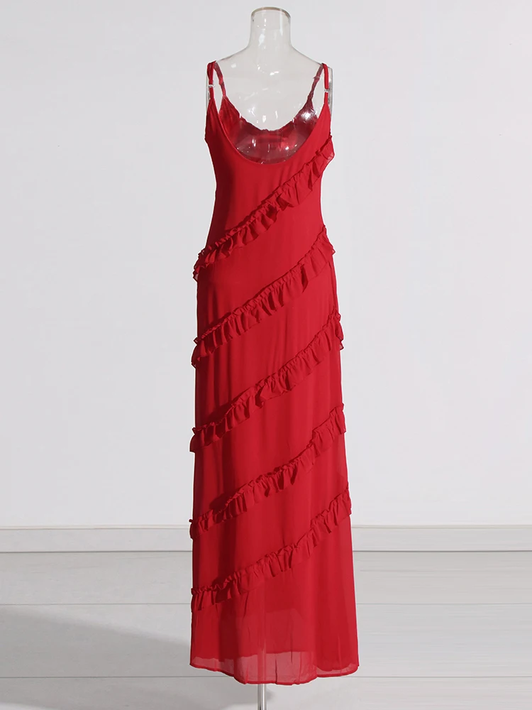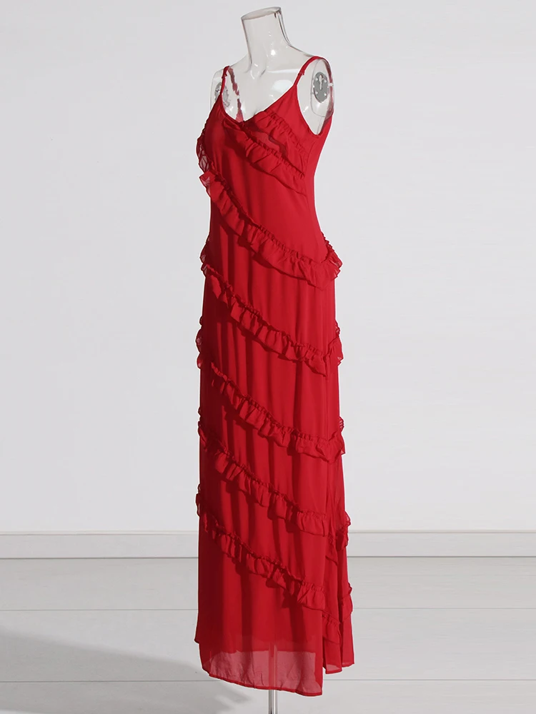 VGH Sexy Backless Camisole Dresses For Women V Neck Sleeveless High Waist Patchwork Tierred Ruffles Split Solid Dress Female New