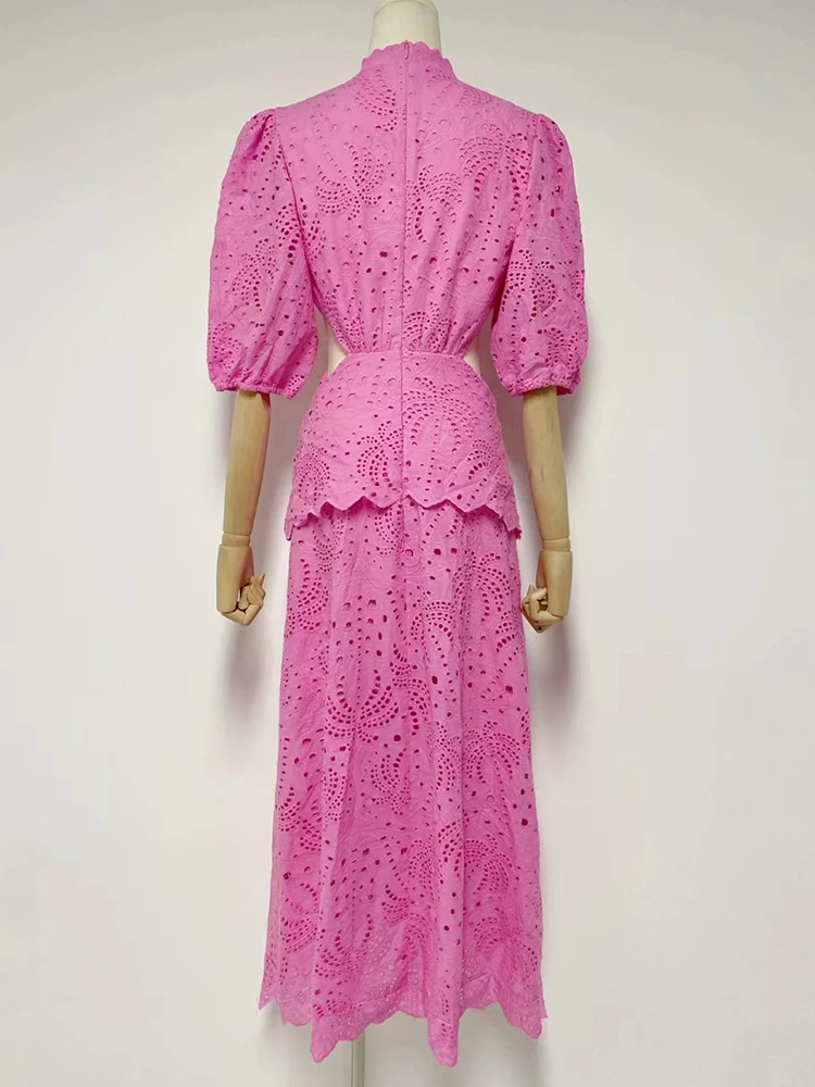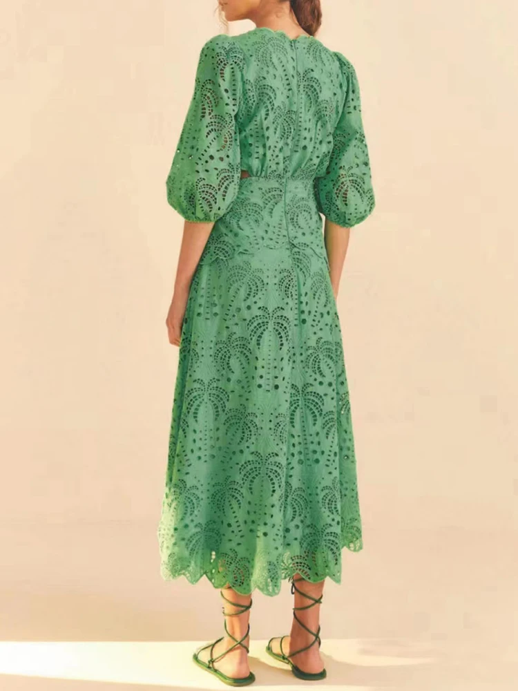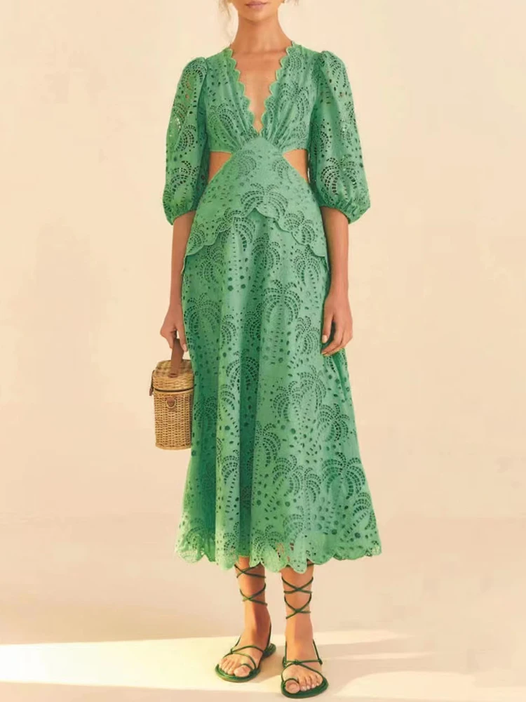 VGH Solid Vintage Dresses For Women V Neck Puff Sleeve High Waist Hollow Out Patchwork Zippers Elegant Fashion Dress Female 2023