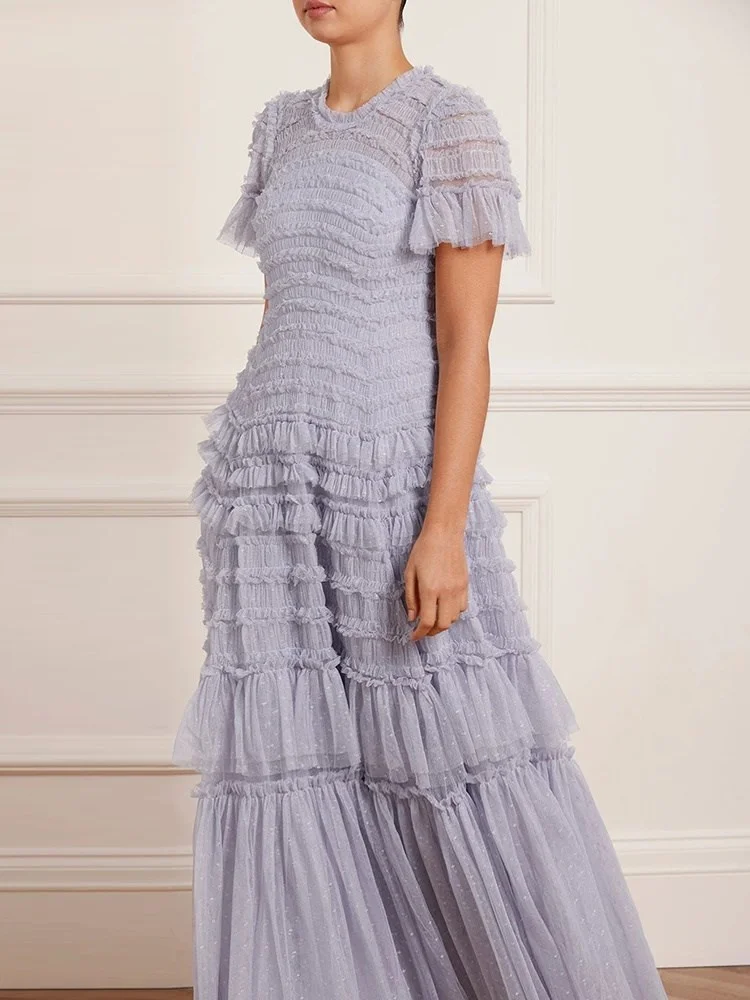 VGH Spliced Edible Tree Fungus Dress For Women Round Neck Short Sleeve High Waist Solid Mesh Ruched Elegant Dresses Female New