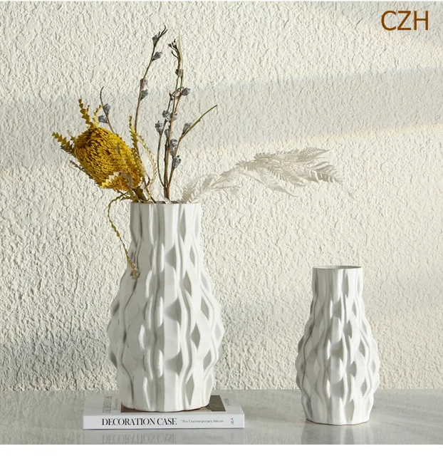 1. Description: Weave Texture Ceramics Vase Modern Bisque Relief Pottery Flower Vase Front Room Decor Handicraft Ornament Housewarming Present.