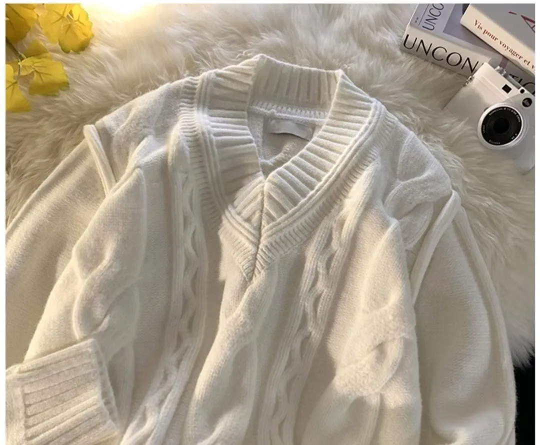 White, Black V-Neck Sweater Men’s Spring And Autumn Three-Dimensional Twist Knit Shirt