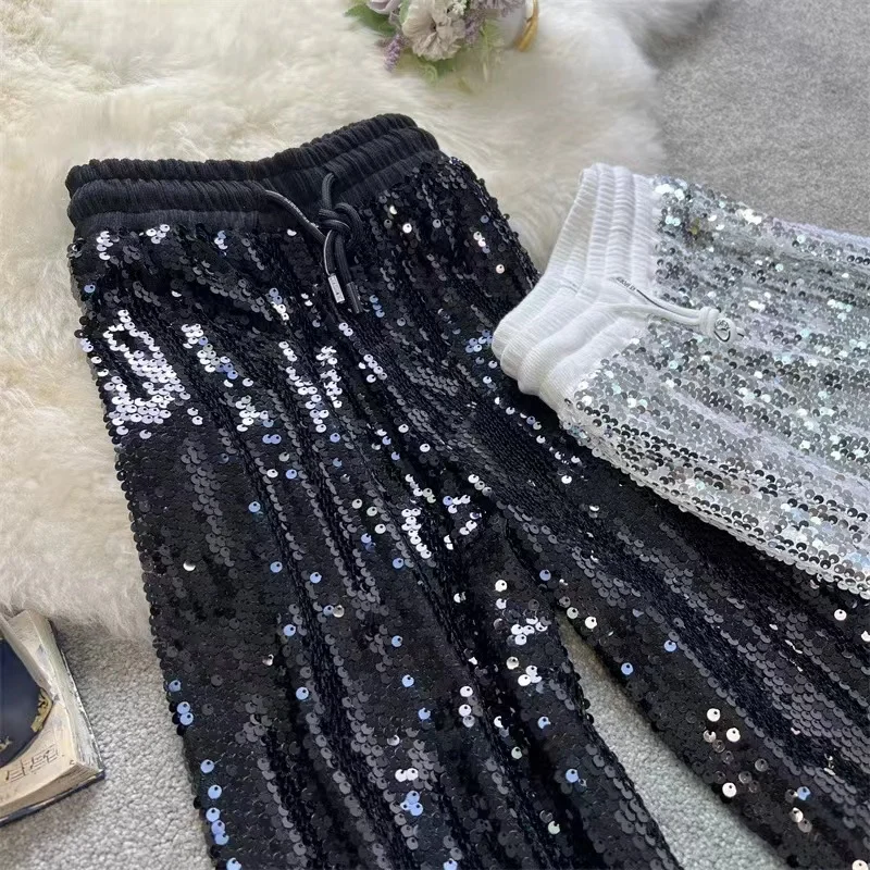 Women Fashion Shining White Trousers Tall Waist Sequins Flares Spring Silver Glitter Sparkling Y2k Relaxation Wide-legged Pants