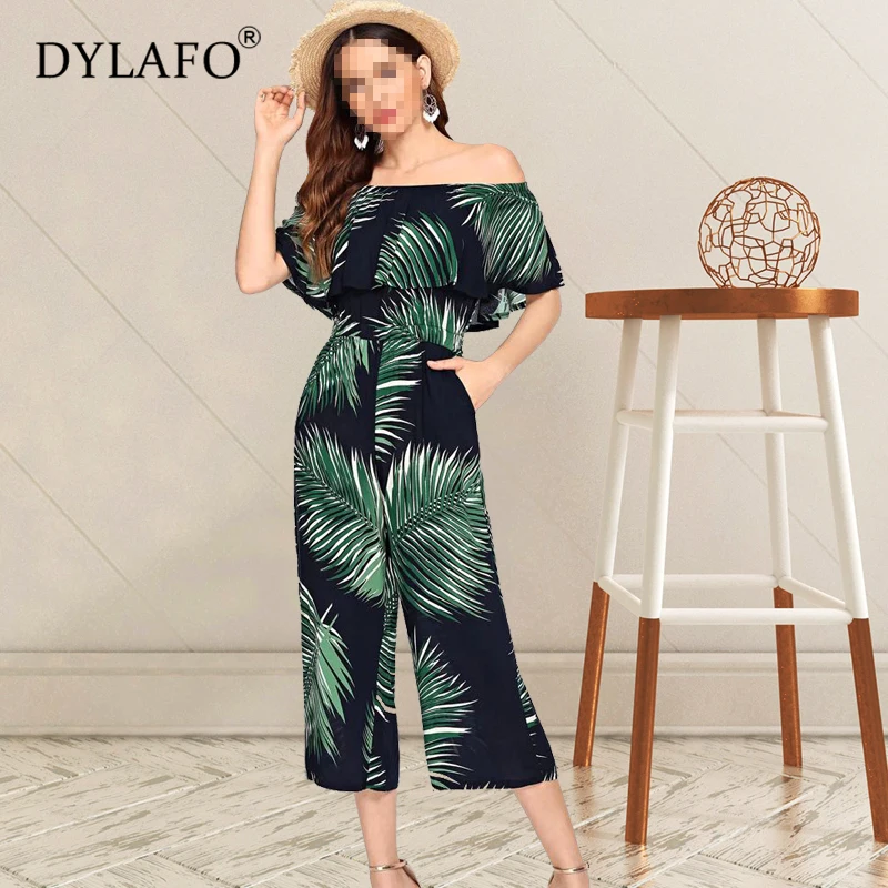 Women Summer Leaf Print Jumpsuit Rompers Off Shoulder Wide Leg Streetwear Rompers Sexy Night Club Party Elegant Casual Overalls