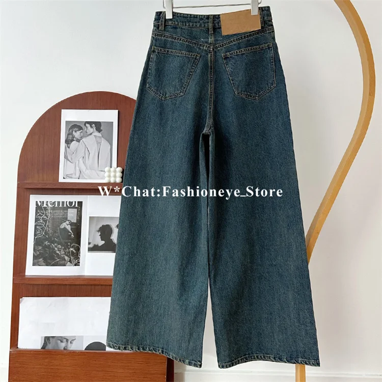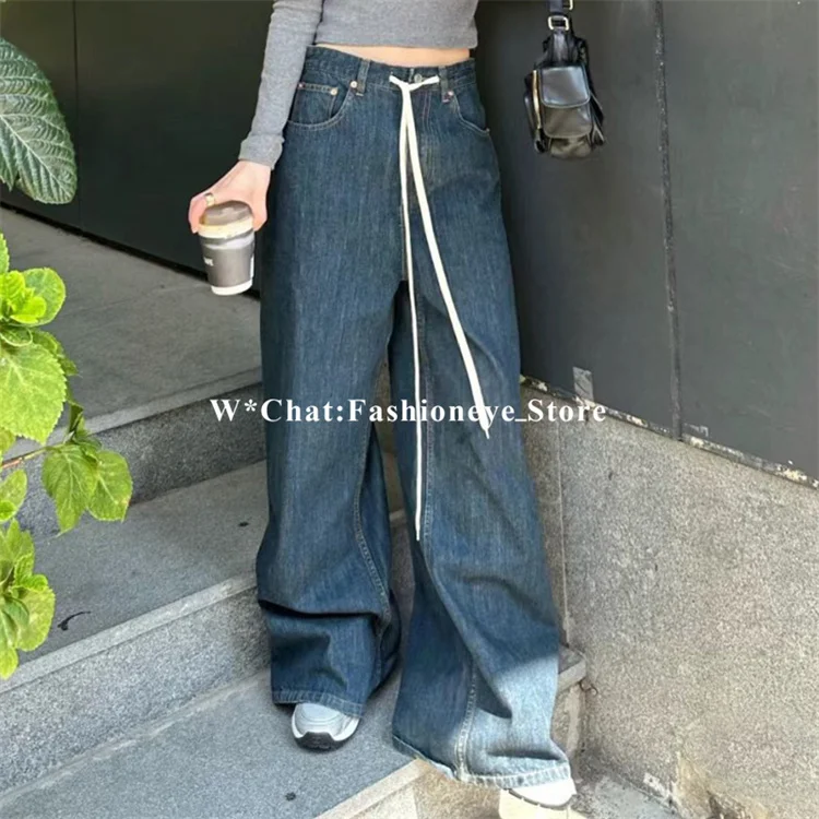 Women’s Pants 2023 Winter New Vintage Blue Washed Pure Cotton Denim Trousers High Waist Loose Casual Drawstring Wid-Leg Pants N1116
