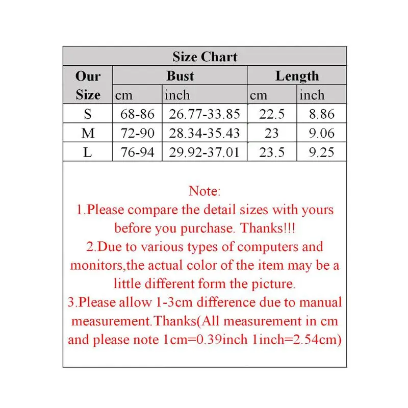 Warm prompt: 1.Asian people size is 1 or 2 sizes smaller than European and American. 2.Please note that low temperature washed,do not bleach and place under the blazing sun for quite a long time. 3.As different measuring methods,it will occur 1-3 cm deviation about the items,please ensure that it is okay for you before ordering. 4.Because of different monitors and lamplight,the picture may not reflect the actual color of the item,really thank you for your kind understanding! Package includes: 1 x Crop Top(without retail package)