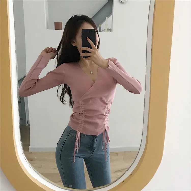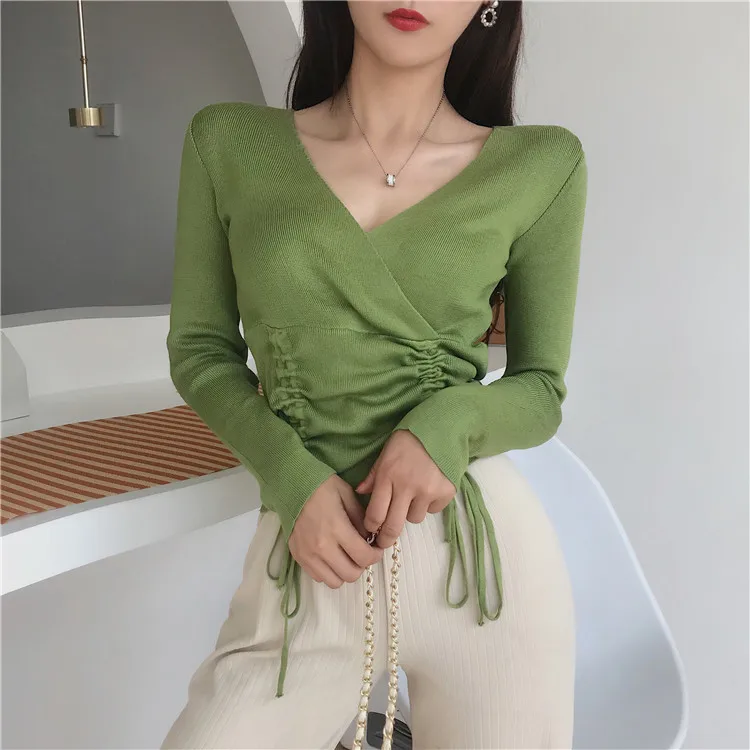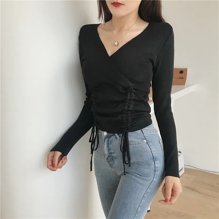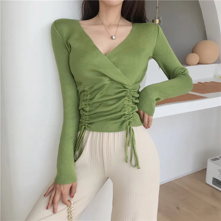 Women’s V-neck Knitted Full Sleeve Solid Cropped Sweater Shirts Girls Sweaters Pullovers Jumpers Crop Tops for Female