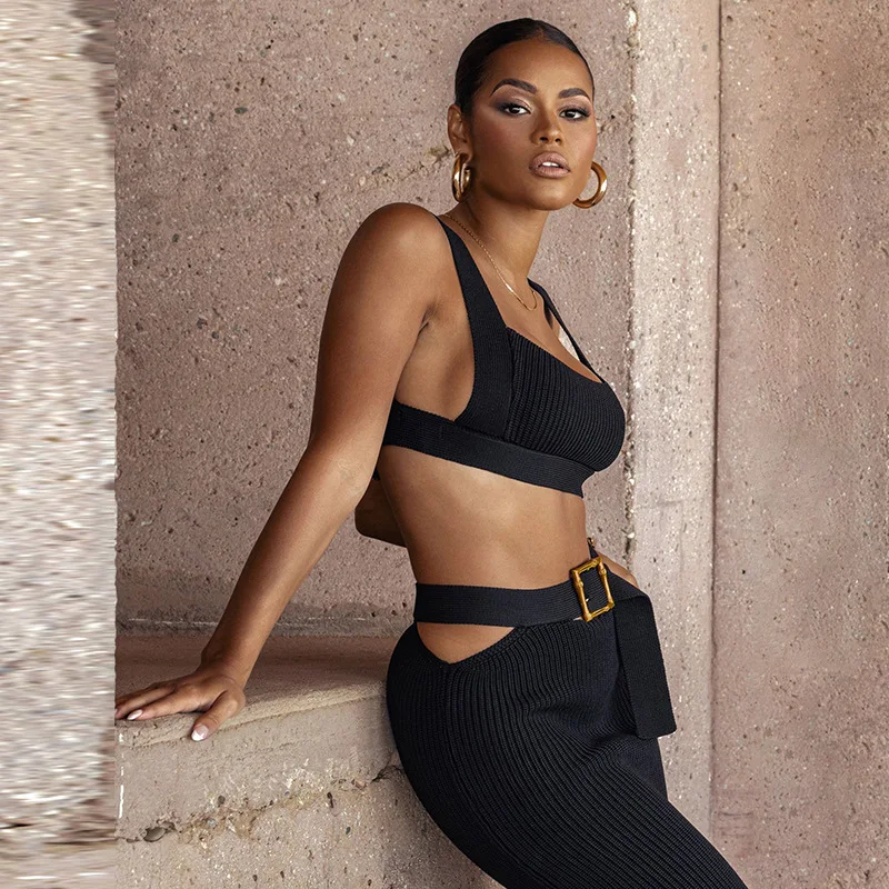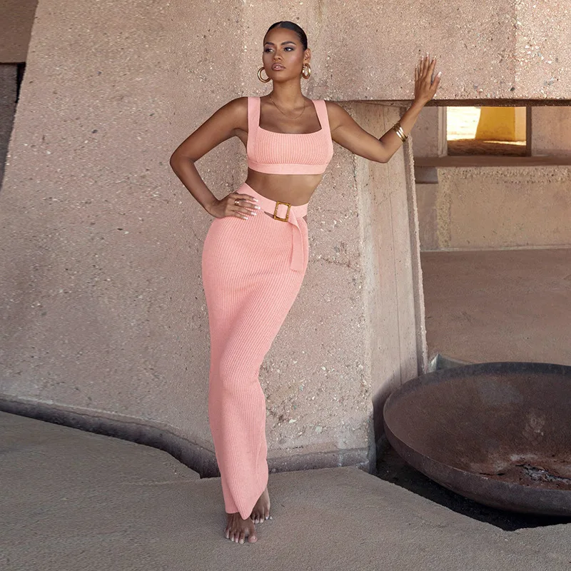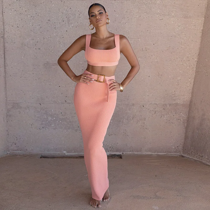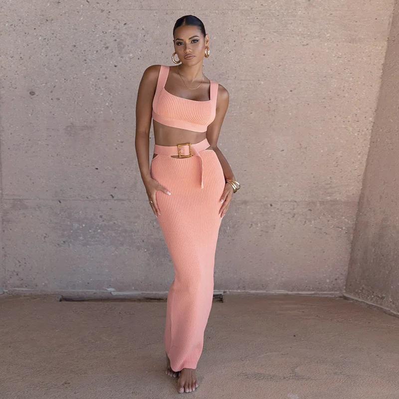 Y2K Sexy Summer Long Prom Dresses 2 Pieces Top&Party Gown With Belt Daily Women Hot Girl Club Evening Robe Skirt Birthday Knited
